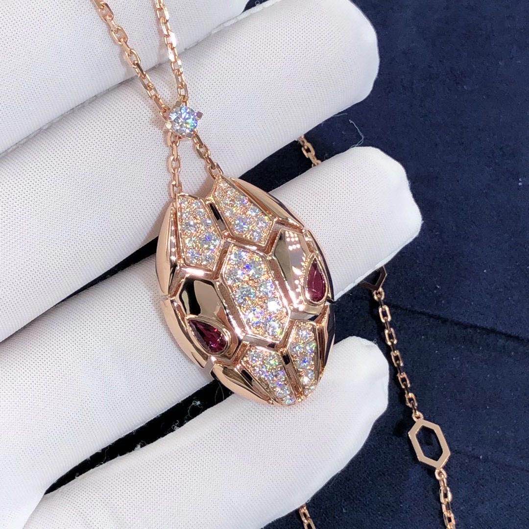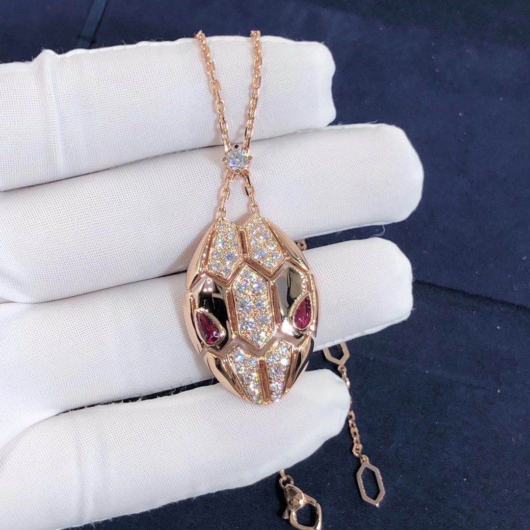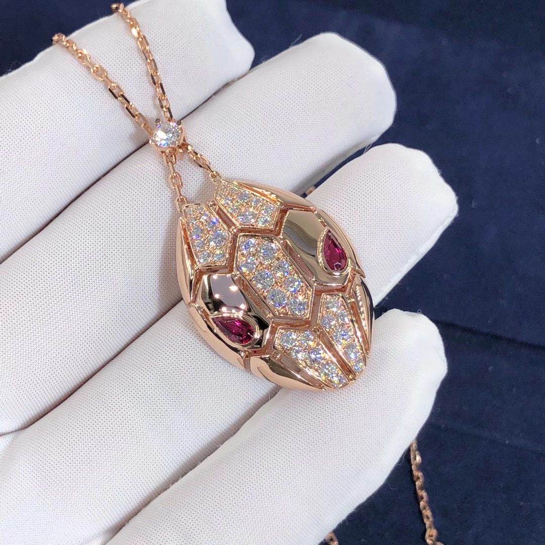 • 18K Rose Gold Serpenti Necklace with Rubellite Eyes and Semi Pave Diamonds