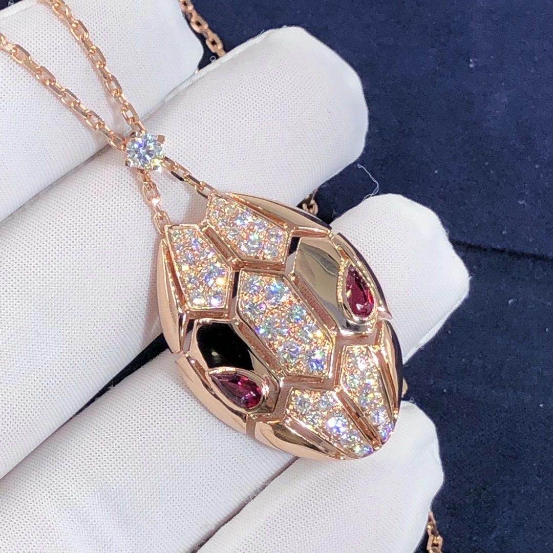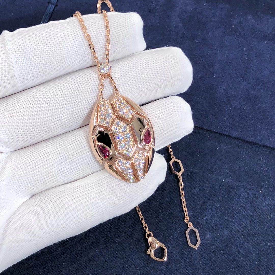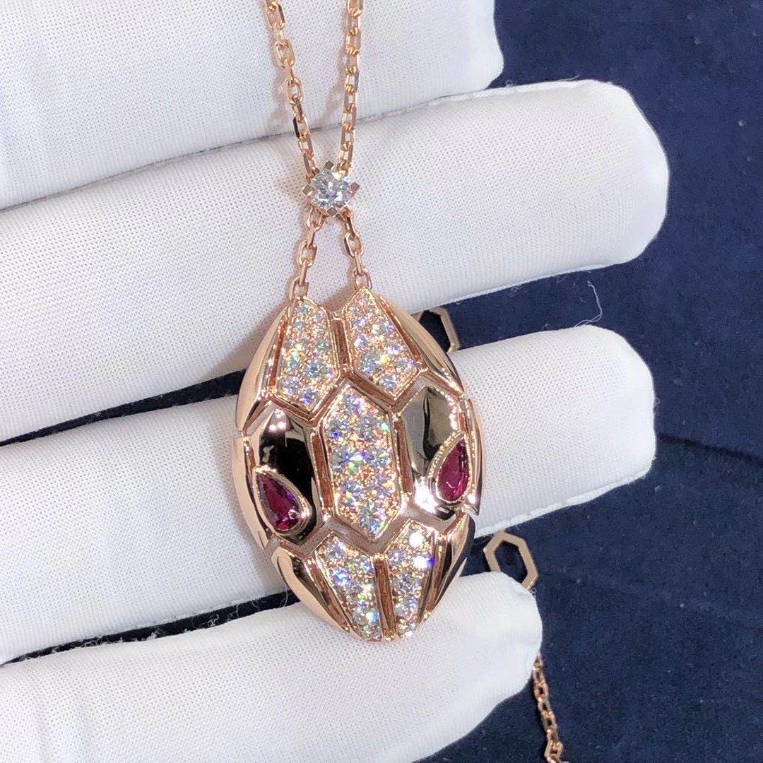 • 18K Rose Gold Serpenti Necklace with Rubellite Eyes and Semi Pave Diamonds