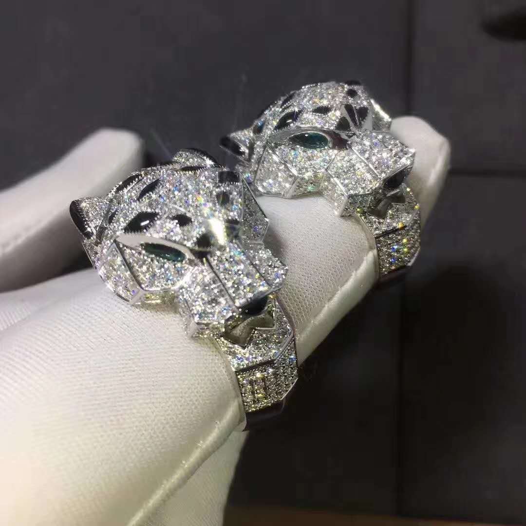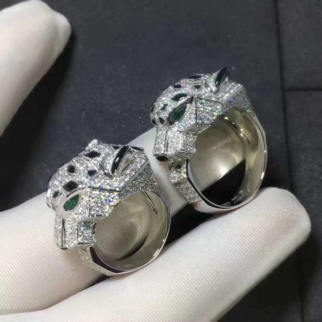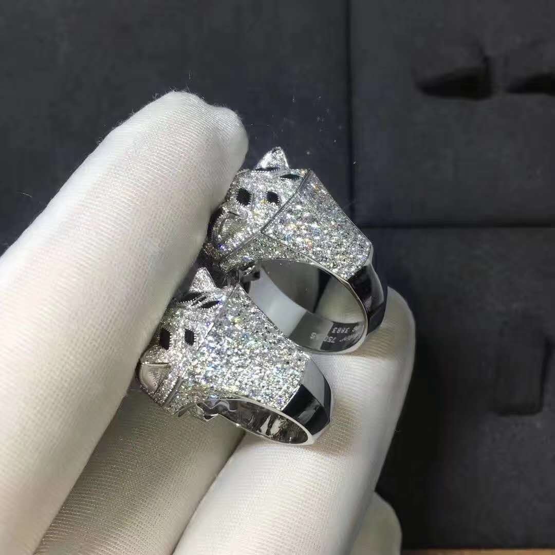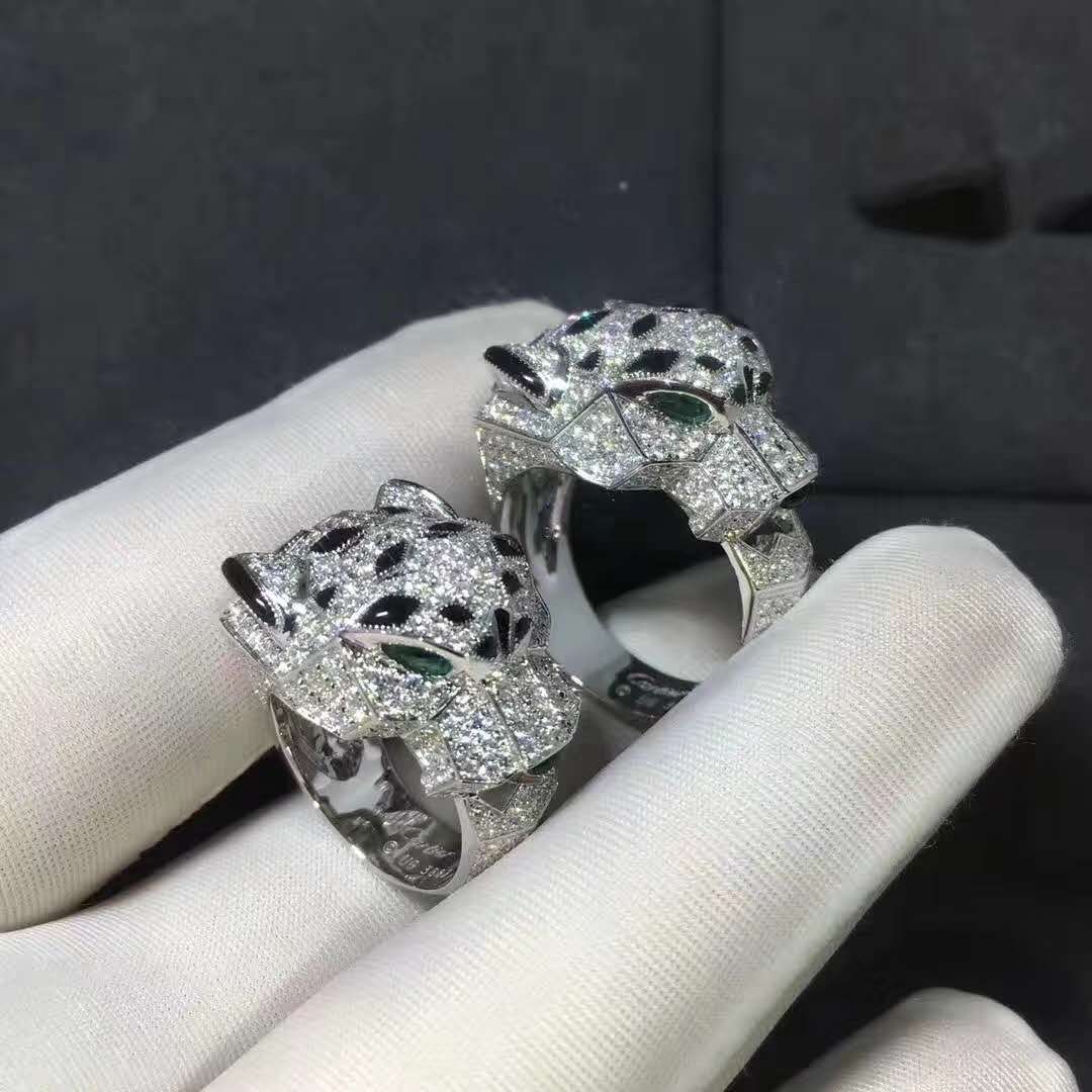 Panthere de Cartier full pave diamond ring. Featuring onyx detalis and emerald eyes. From Cartier’s item description it states that it has 365 round brilliant cut diamonds weighting a total of 2.55 carats.