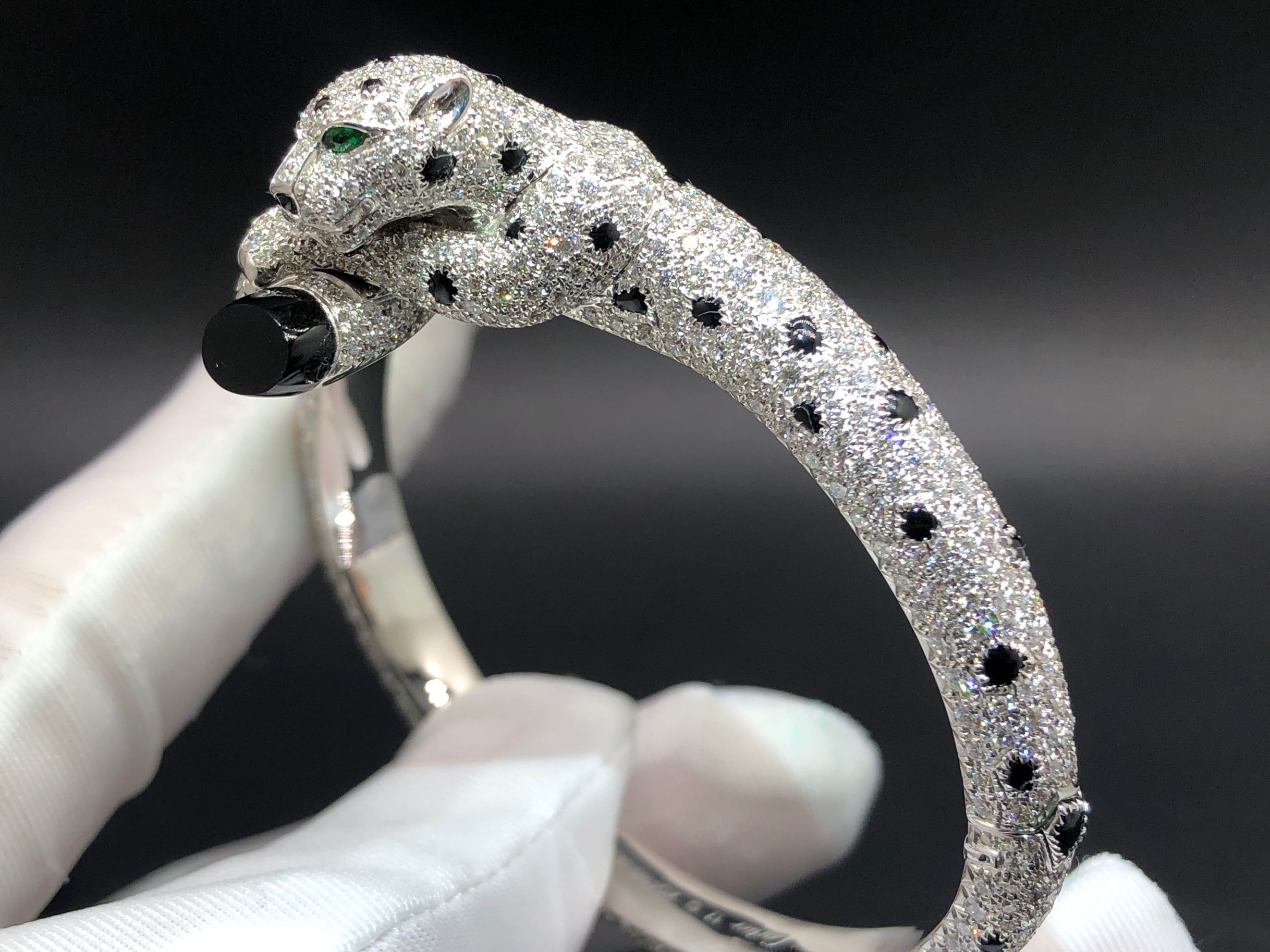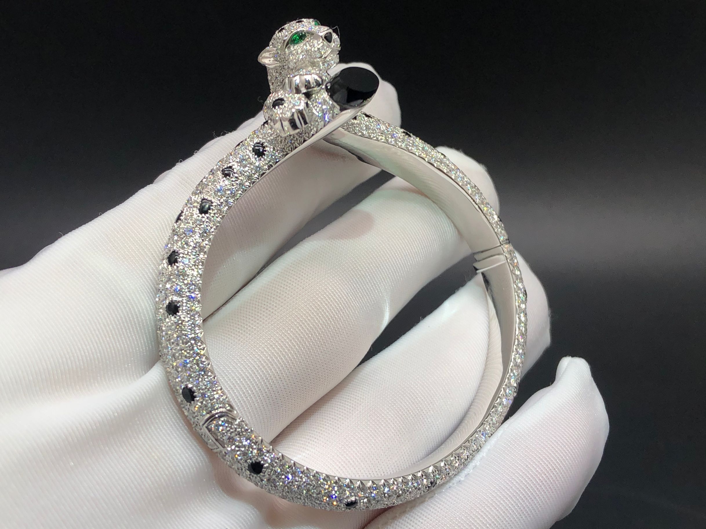 Panthère de Cartier bracelet, 18K white gold, set with 833 brilliant-cut diamondstotaling 9 carats, emeralds and onyx.