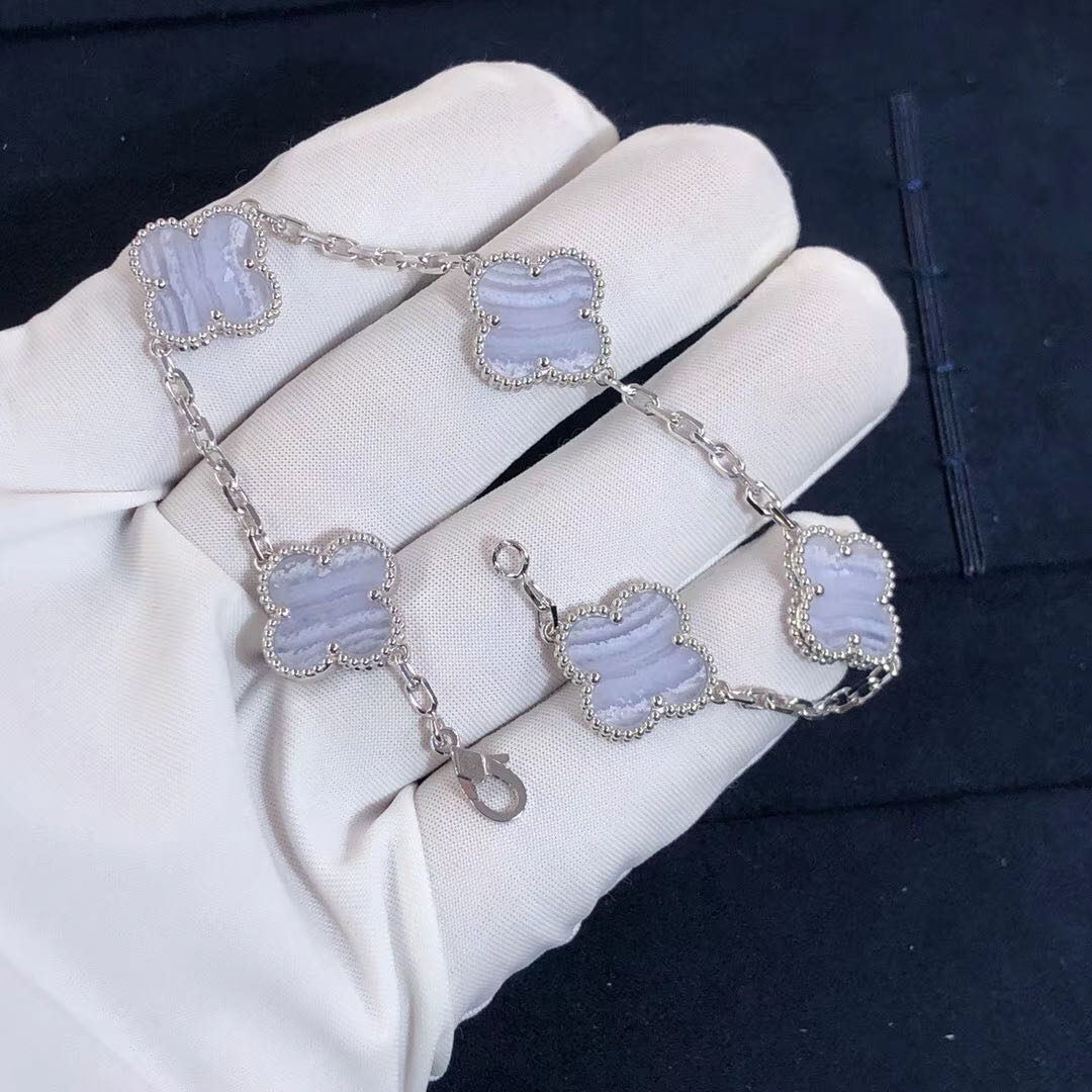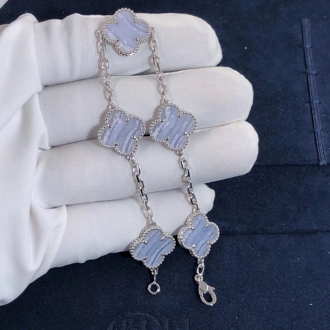 Five clovers means five times the luck with Van Cleef & Arpels’ 5 Motif Alhambra Bracelet! The natural striations in the chalcedony motifs give them a banded appearance that changes from gray to white. Set in and edged with 18K white gold beading, they are linked by a delicate chain that secures with a lobster clasp. Encircle your wrist with this Alhambra that is in very good condition with light wear and hallmarked edges on one of the motifs!