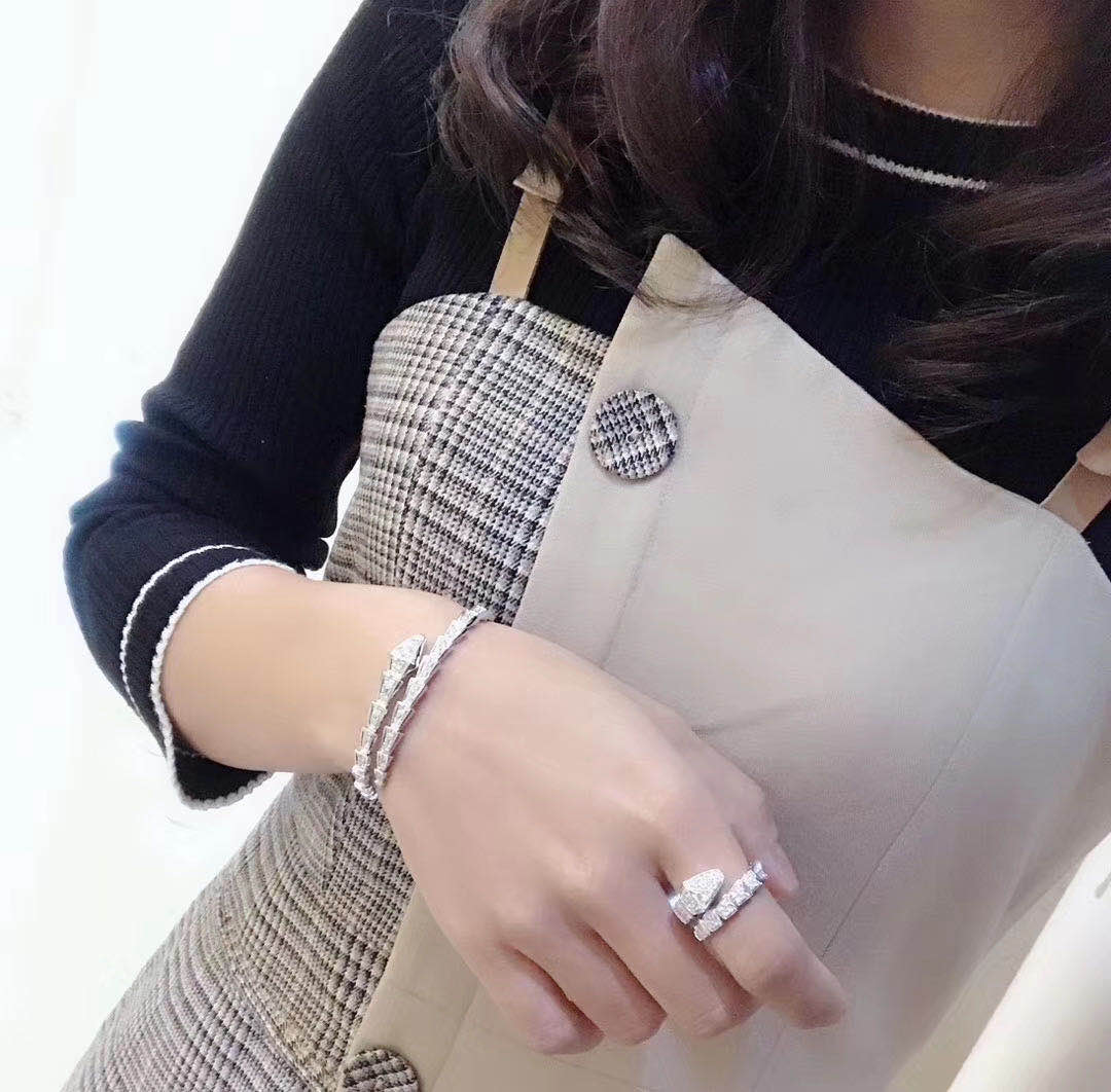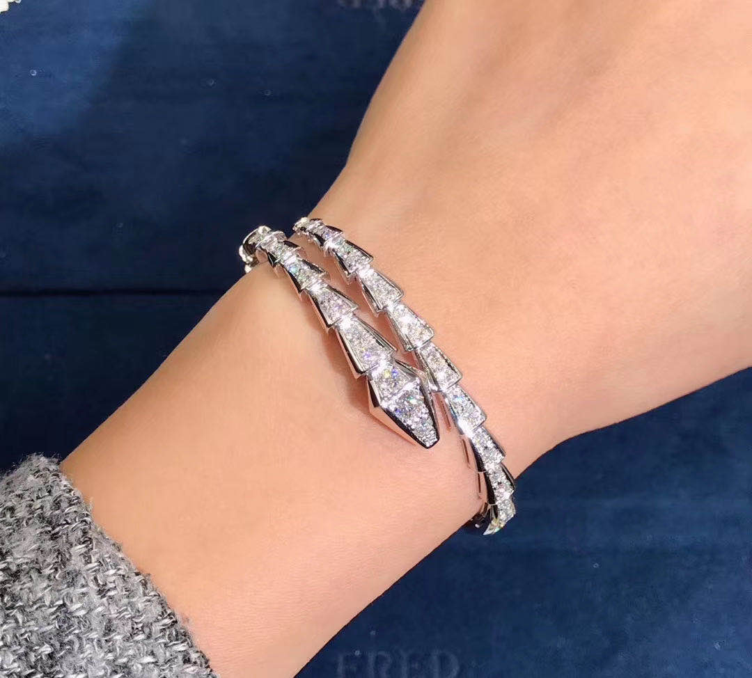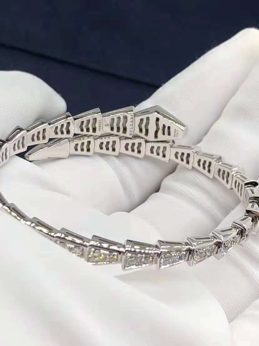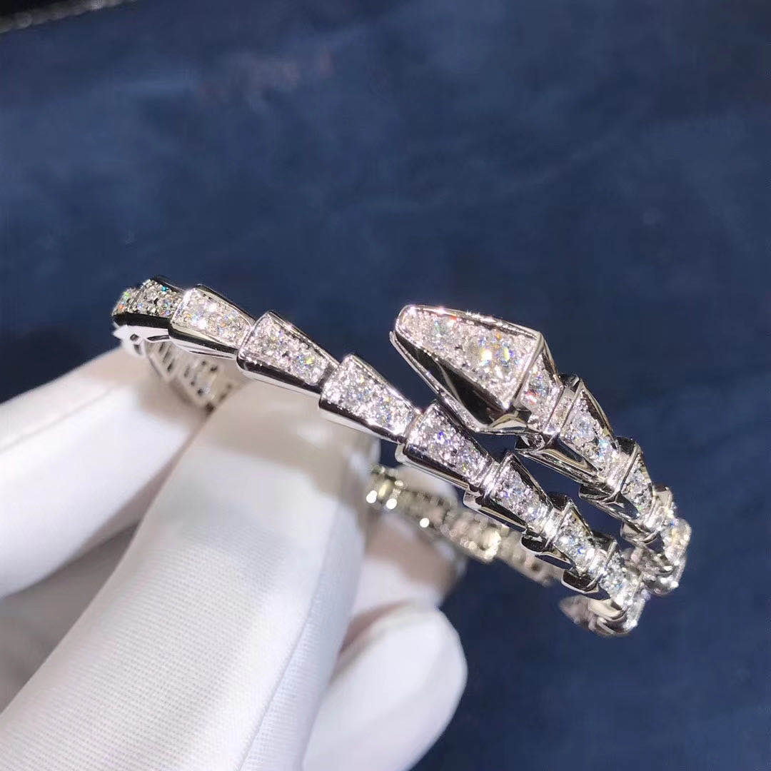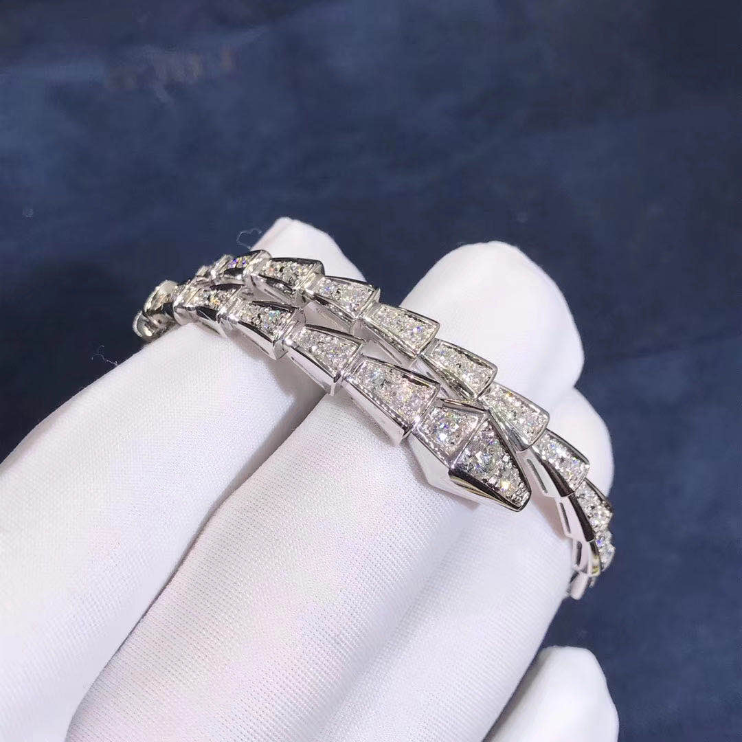 • Bvlgari Serpenti one-coil slim bracelet in 18kt white gold with full pavé diamonds