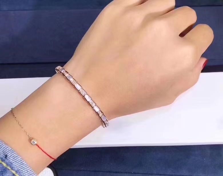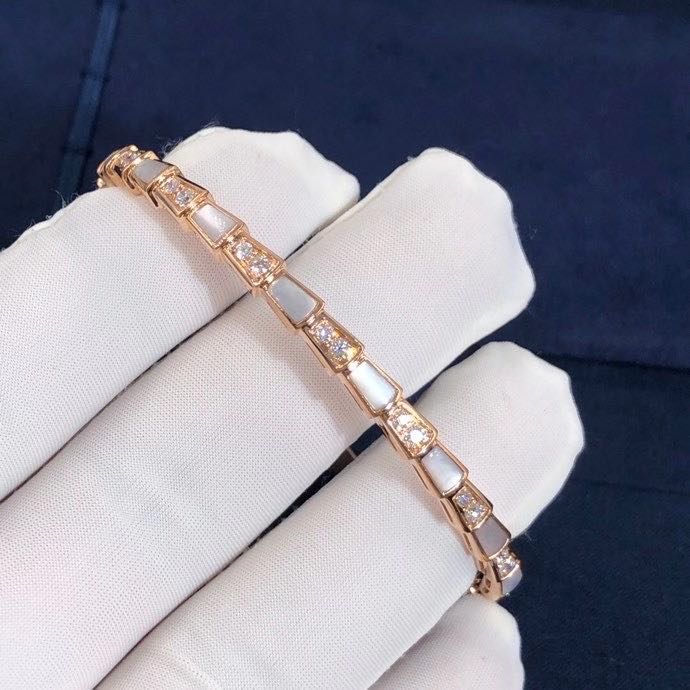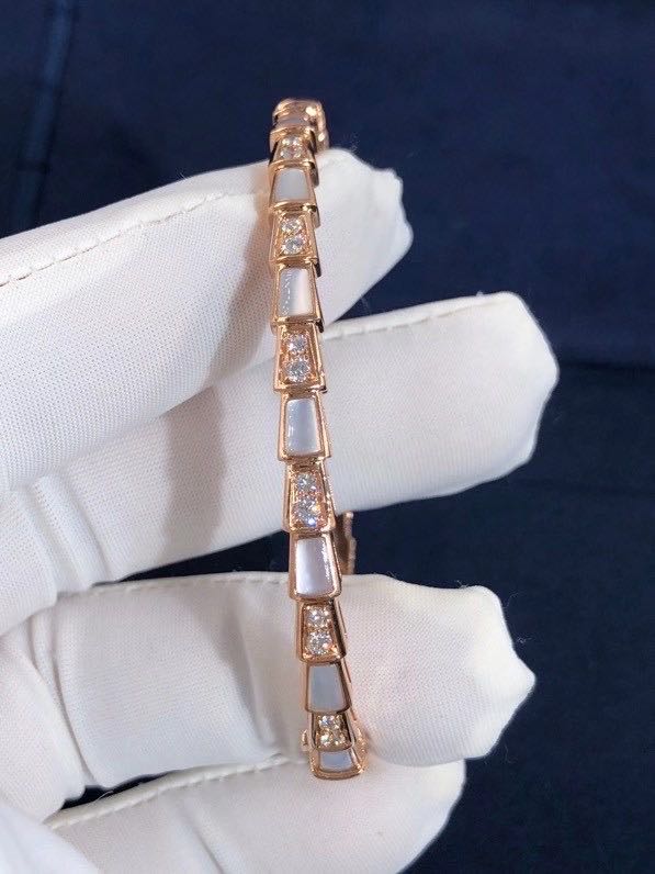 Evocative of the viper’s spiral move before its strike,the bracelet coils sensually around the wrist mesmerize with its enveloping curves. Sophisticared and stylish,the lewel combines the dangerous beauty of the scales with the sinuosity of the snake,camouflaging sensuality and temptation with a hypnotic design,light and shadow,knowledge and desire,the two facets the serpent’s nature are revealed. Serpenti bracelet in 18 k rose gold with mother-of-pearl inserts and pavé diamonds.
