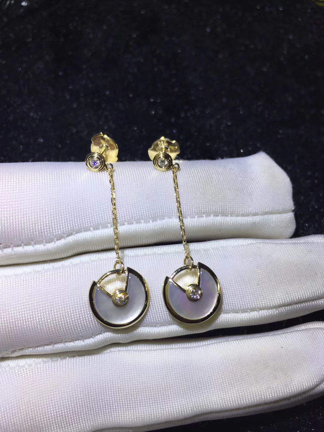 Amulette de Cartier earrings, XS model, 18K yellow gold, white mother-of-pearl, set with 4 brilliant-cut diamonds totaling 0.14 carats. Diameter of motifs: 12 mm.