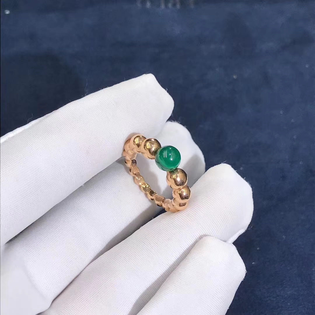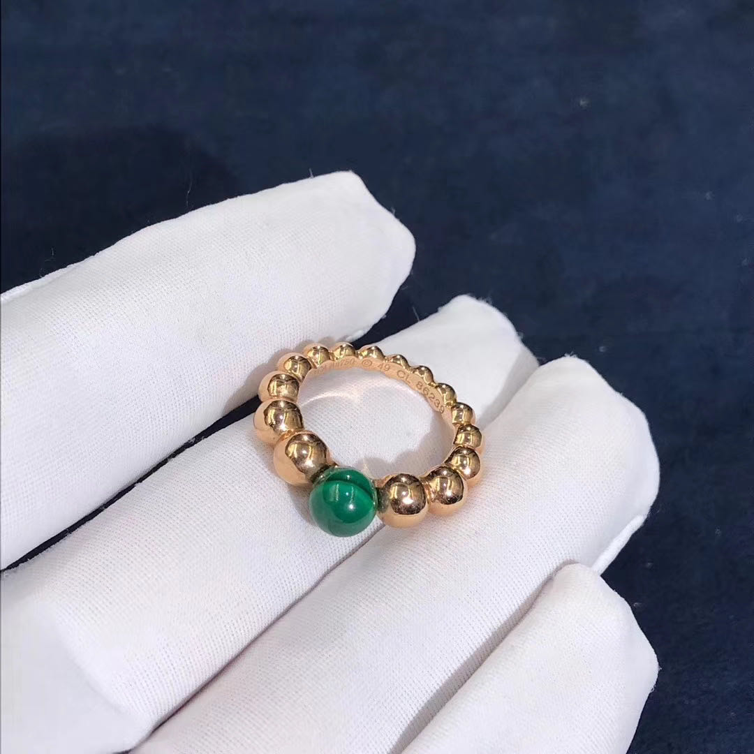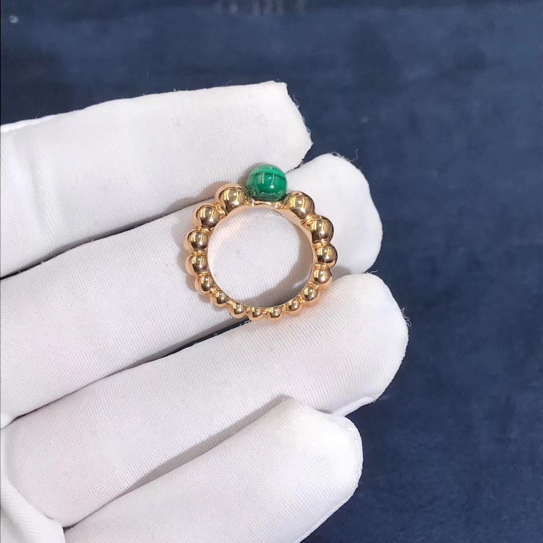 A vivid green malachite and yellow gold stacking ring from the Perlée Couleurs collection by Van Cleef & Arpels. This striking beaded gold ring is made up of graduating polished yellow gold beads that increase in size as they reach the crown, which is set with a polished round malachite. Hand selected by Van Cleef & Arpels to ensure that the green gemstone meets the maison’s exacting standards, the malachite glows with variegated emerald tones. As a member of the Perlée collection, which features the delicate pearled edging technique, this malachite ring is wonderful worn alone or stacked with others in the collection.