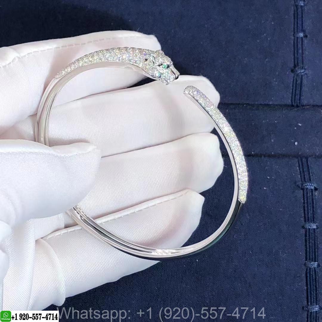 Custom Small Model Panthère de Cartier 18K White Gold Onyx, Emeralds Diamond Bracelet