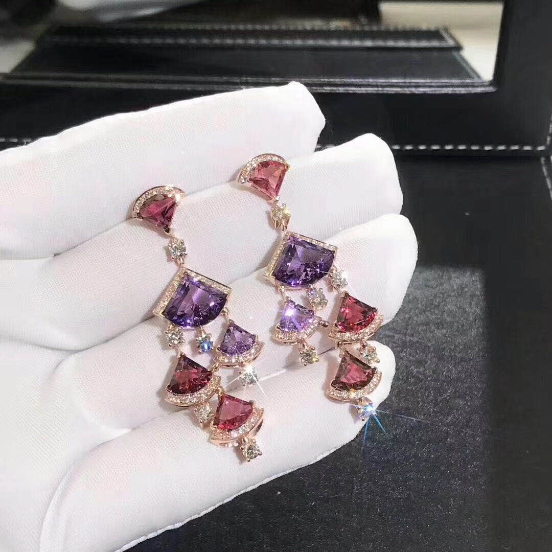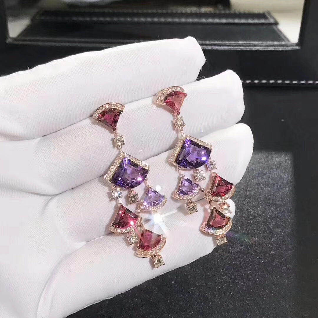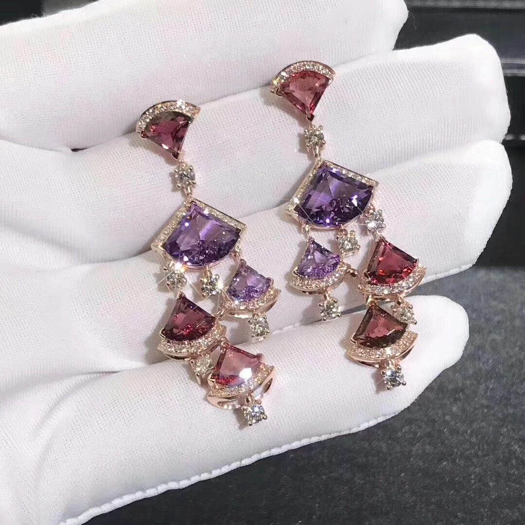 Divas’ Dream earrings in 18 kt rose gold with pink rubellite (6.90 ct), amethyst (6.15 ct) and pavè diamonds (2.05 ct).