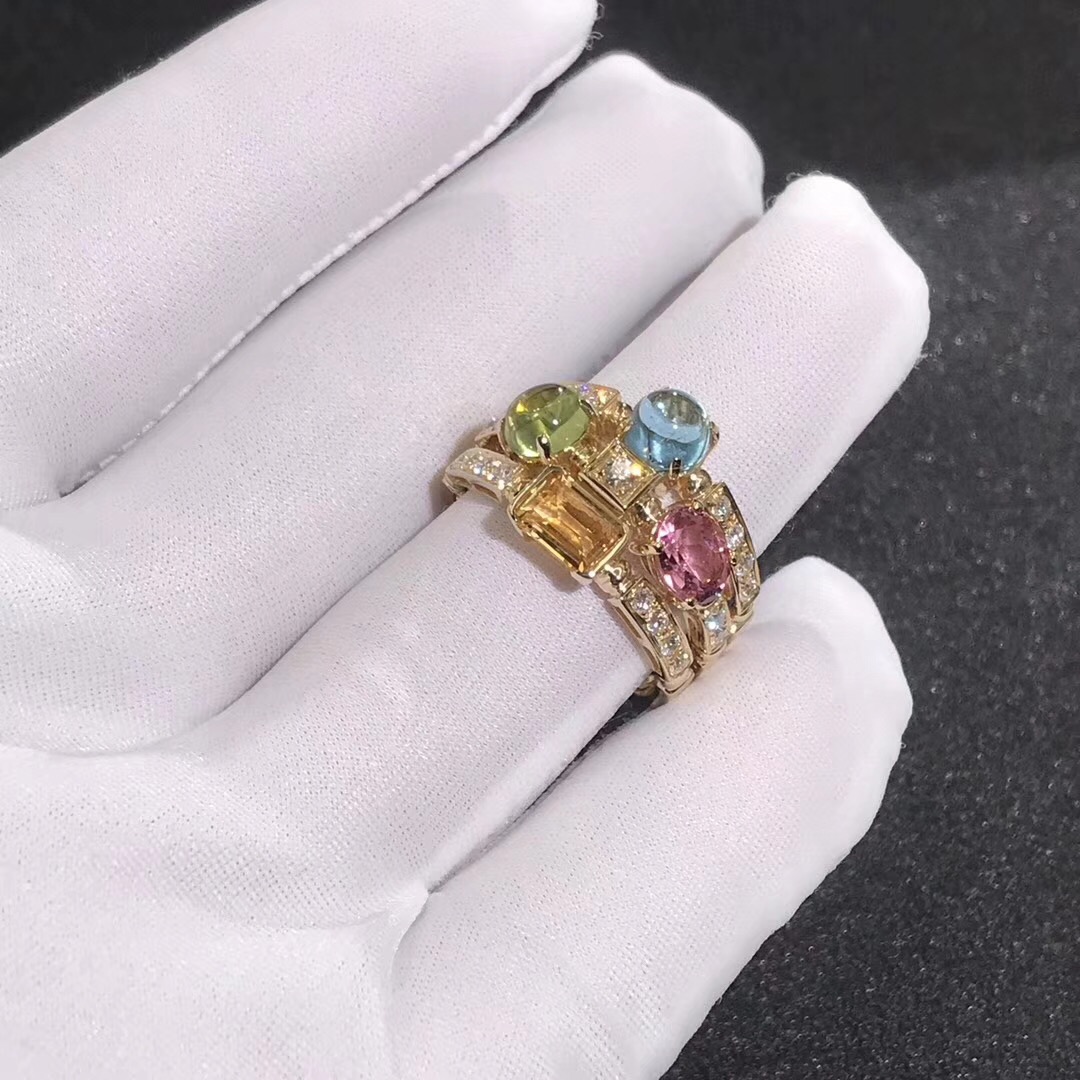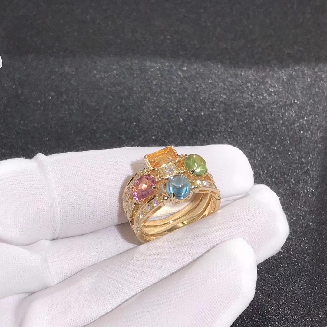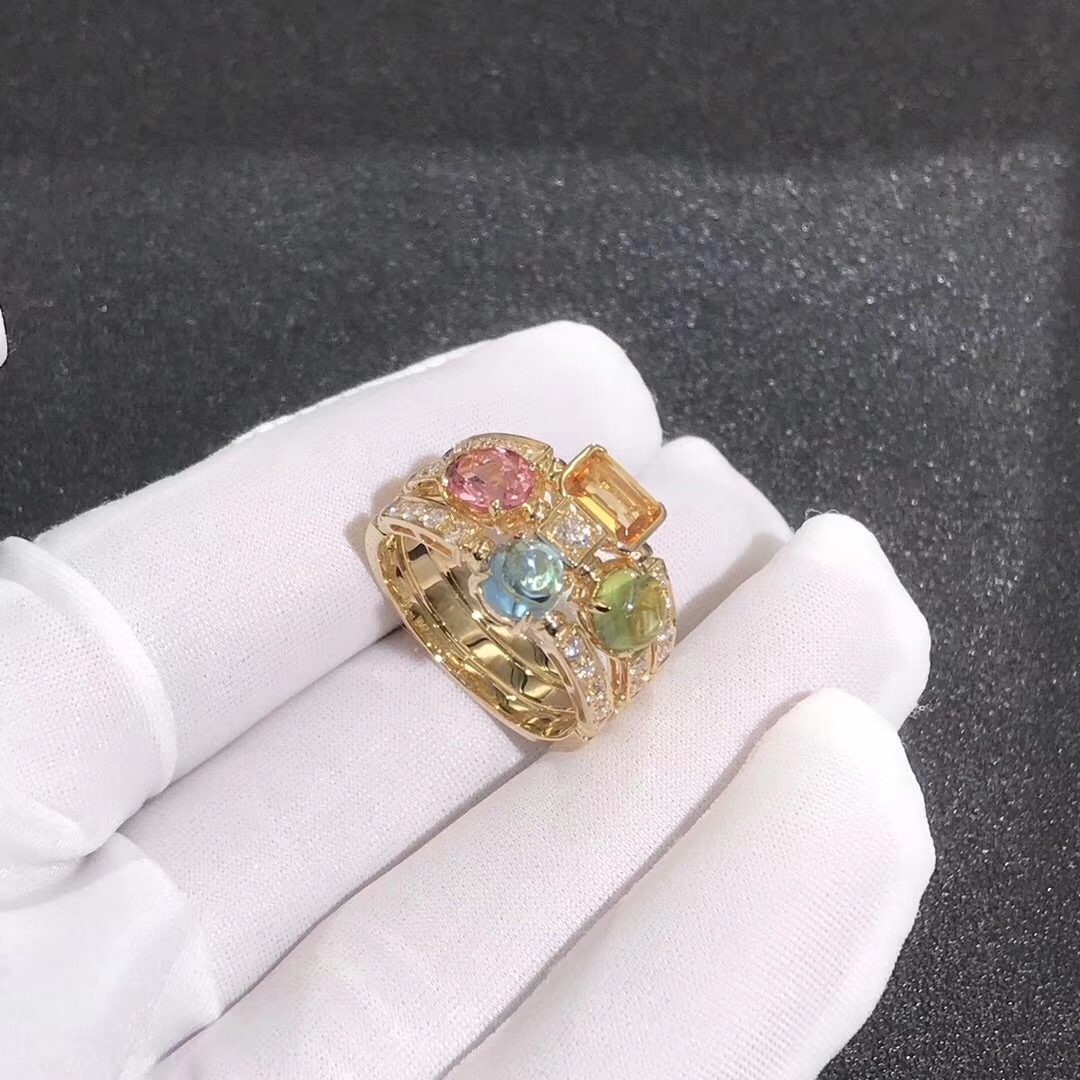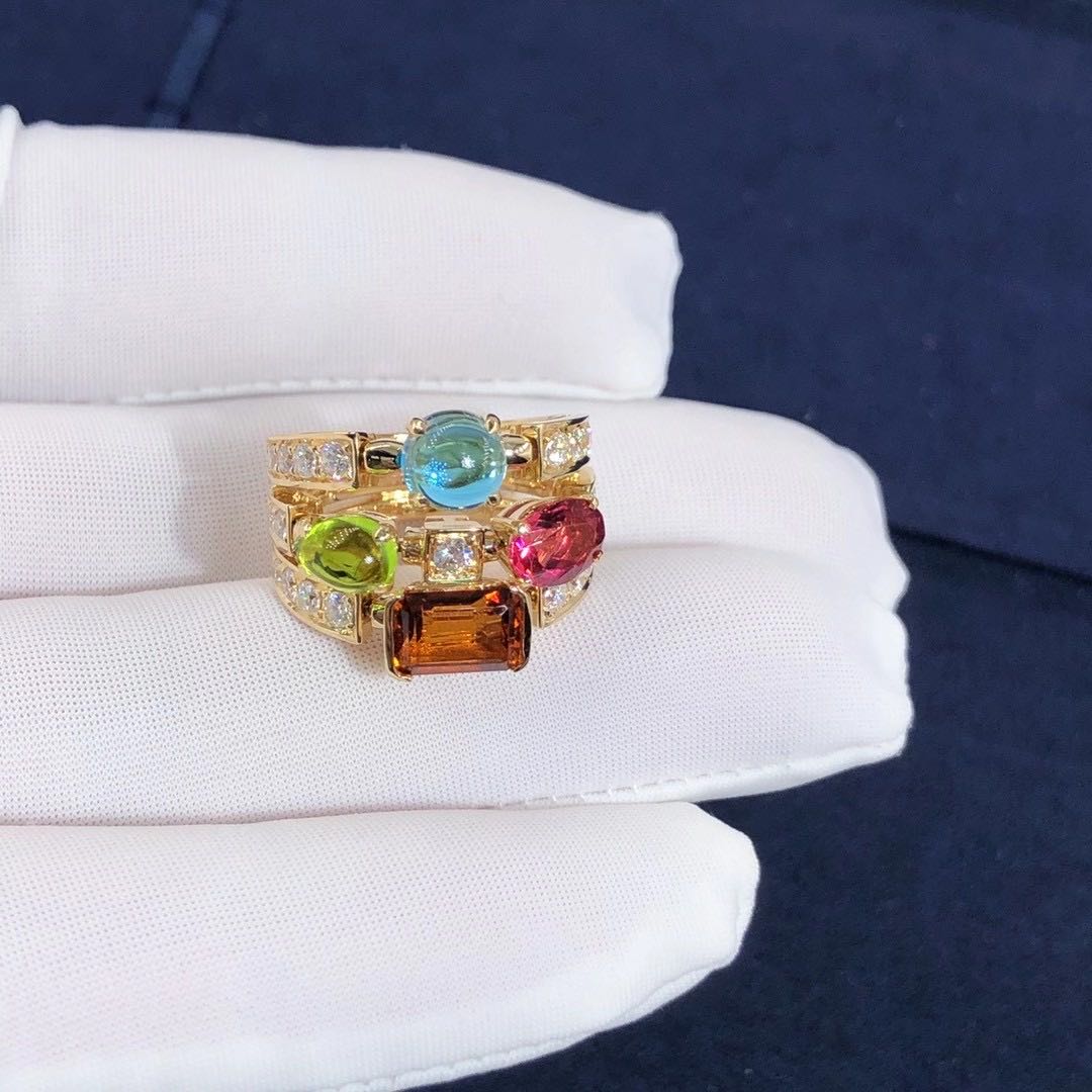 In 18kt yellow gold, this three band ring from Bulgari's Allegra collection is an exquisite finishing touch to evening looks. Featuring intricate pavé diamonds surrounded by a pink tourmaline, peridot, citrine quartz and blue topaz, this ring dazzles elegantly in the light. Composed of three bands with pavé-set brilliant-cut diamond accented with a blue topaz, pink tourmaline, citrine and peridot.