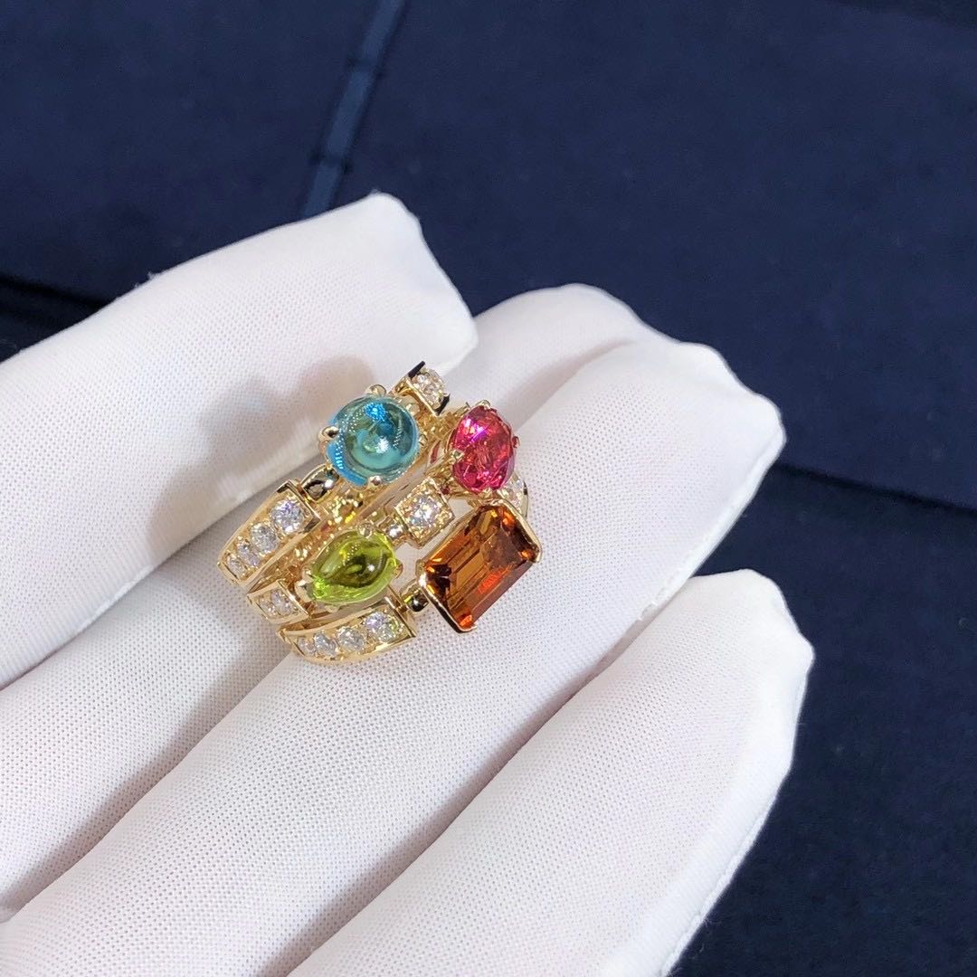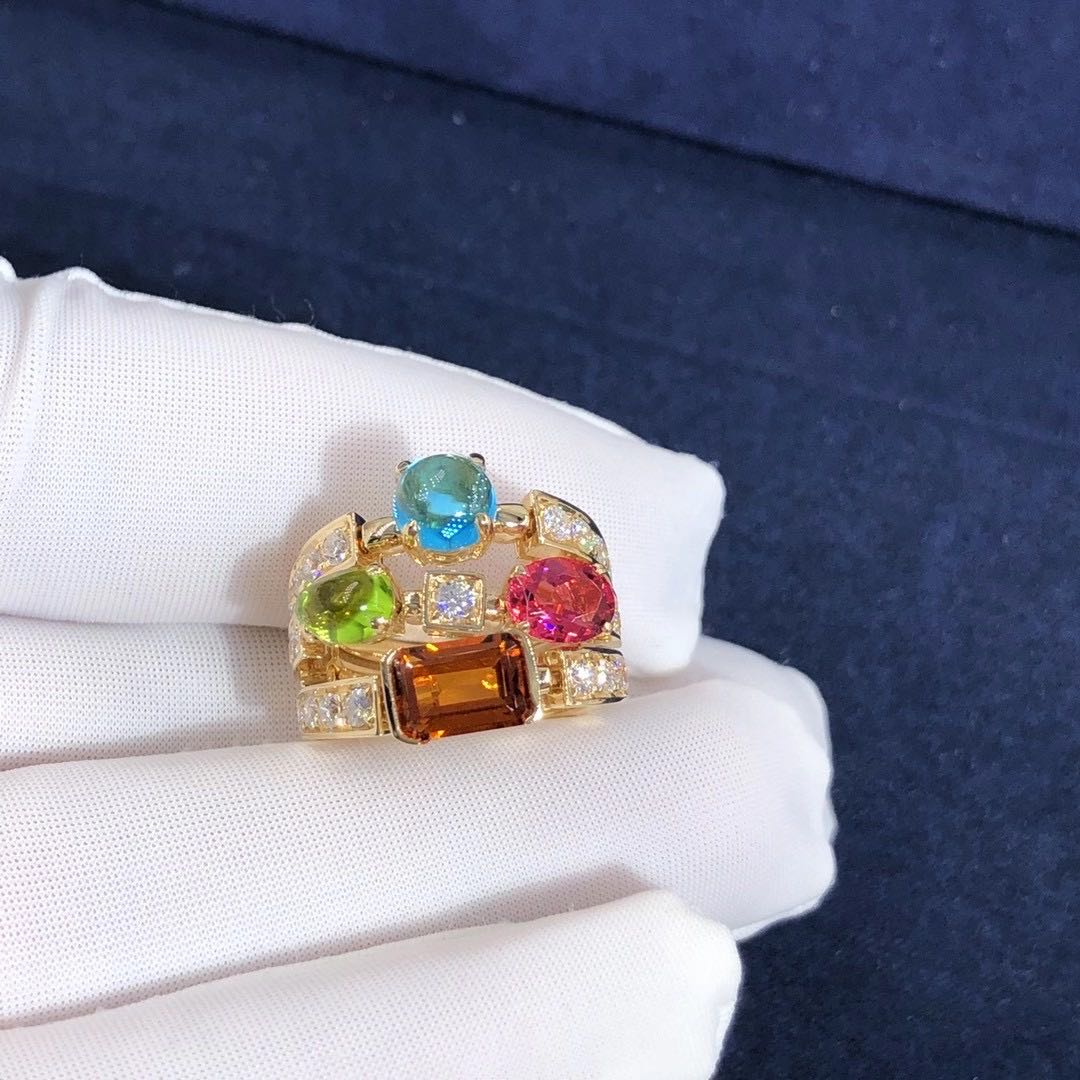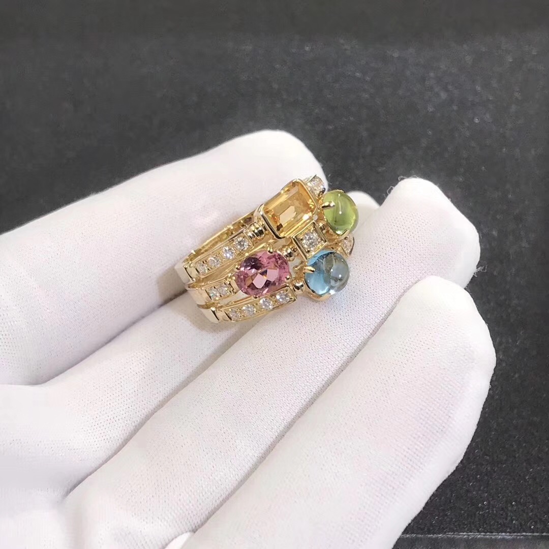 In 18kt yellow gold, this three band ring from Bulgari's Allegra collection is an exquisite finishing touch to evening looks. Featuring intricate pavé diamonds surrounded by a pink tourmaline, peridot, citrine quartz and blue topaz, this ring dazzles elegantly in the light. Composed of three bands with pavé-set brilliant-cut diamond accented with a blue topaz, pink tourmaline, citrine and peridot.
