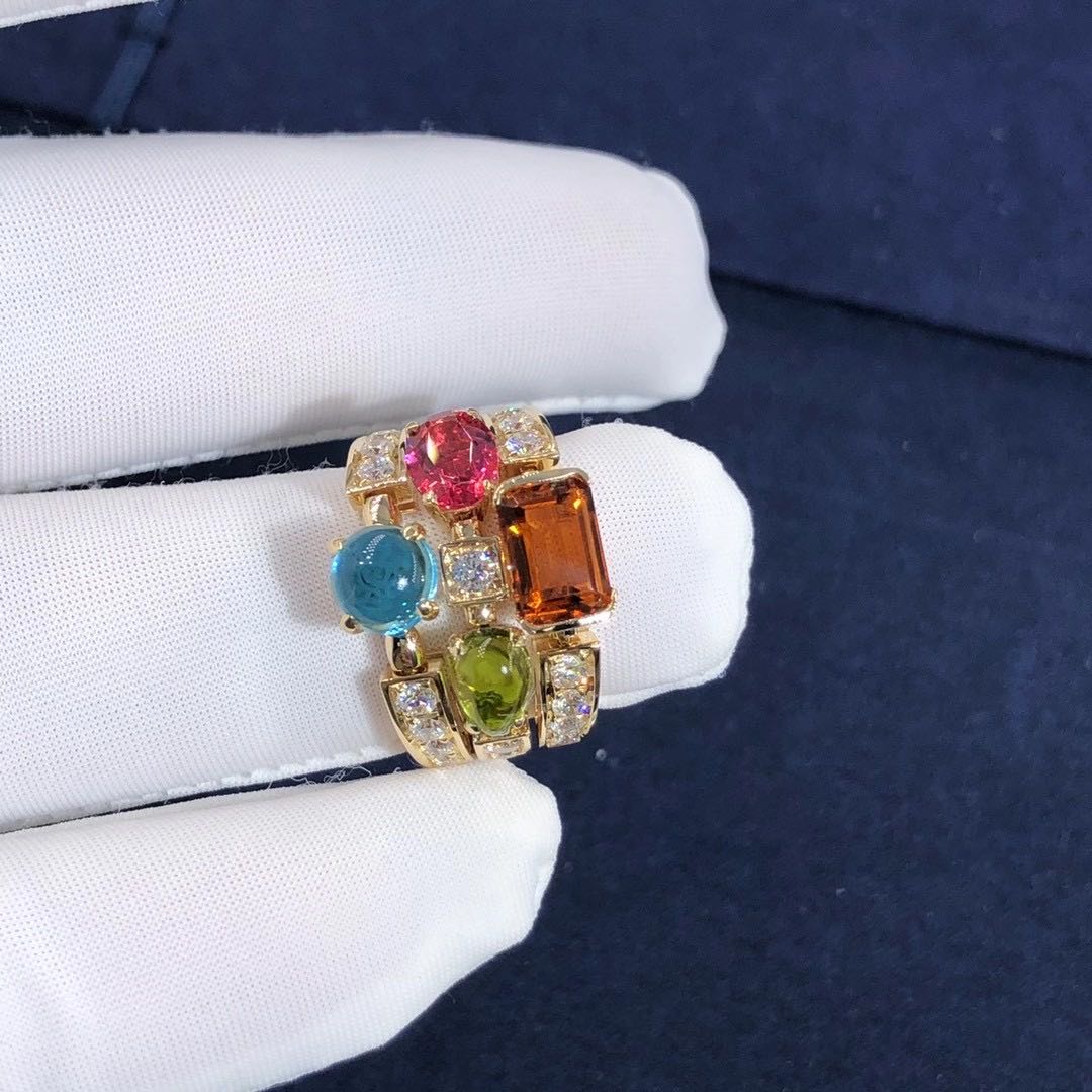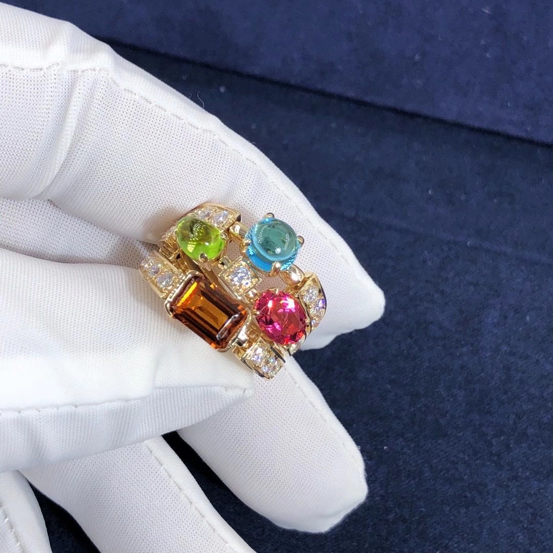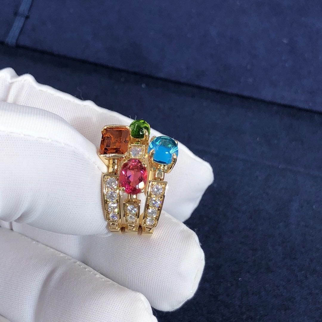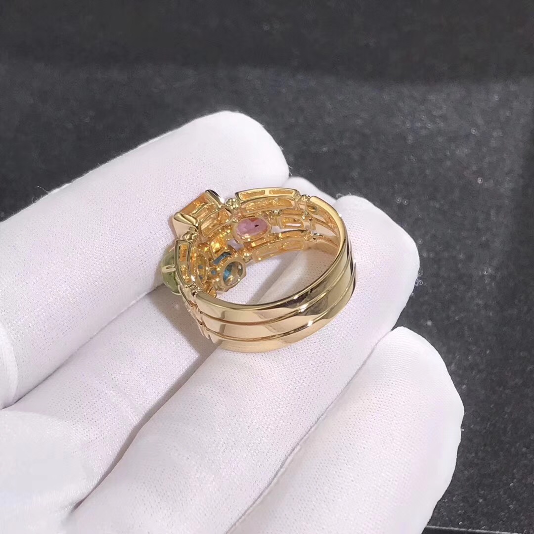 In 18kt yellow gold, this three band ring from Bulgari's Allegra collection is an exquisite finishing touch to evening looks. Featuring intricate pavé diamonds surrounded by a pink tourmaline, peridot, citrine quartz and blue topaz, this ring dazzles elegantly in the light. Composed of three bands with pavé-set brilliant-cut diamond accented with a blue topaz, pink tourmaline, citrine and peridot.