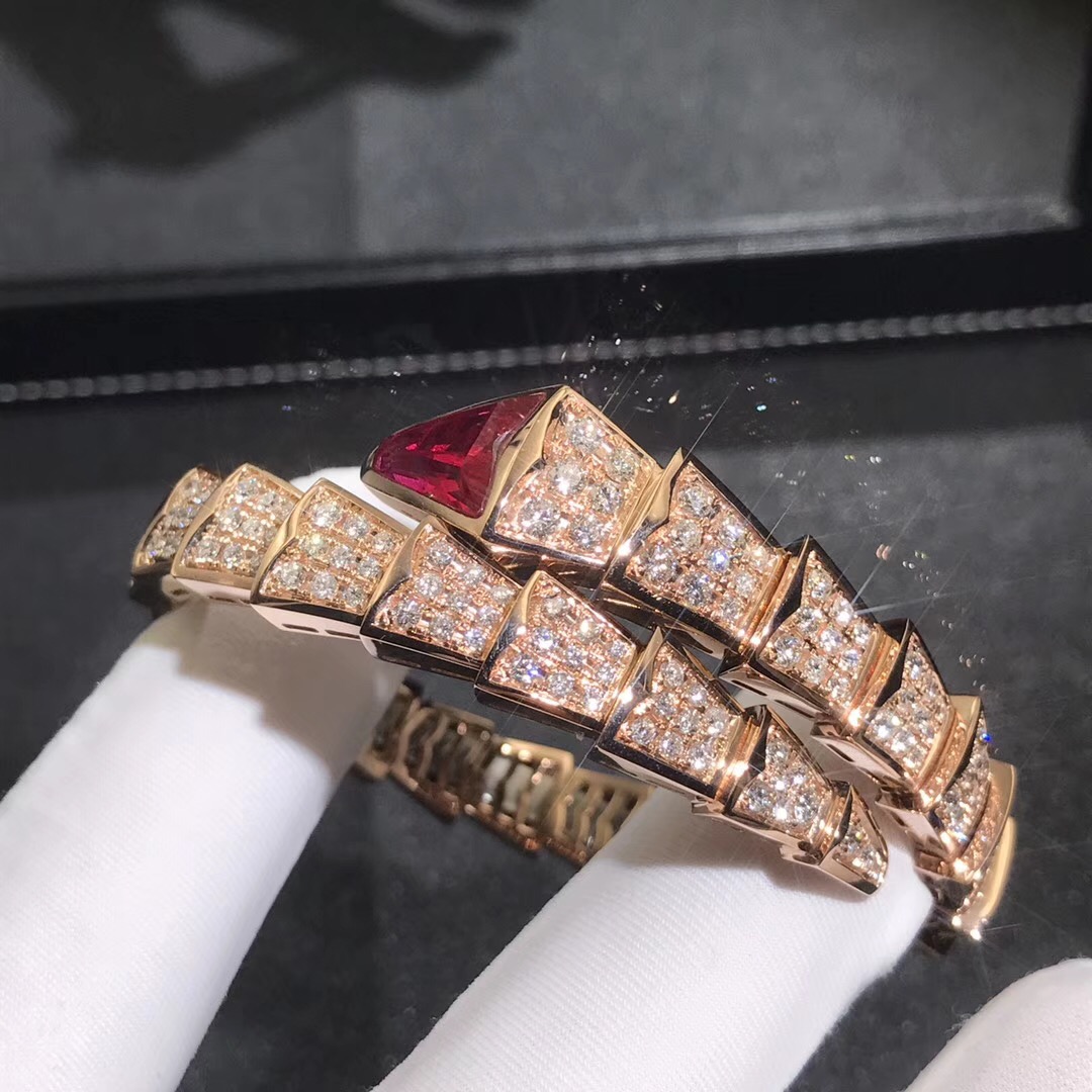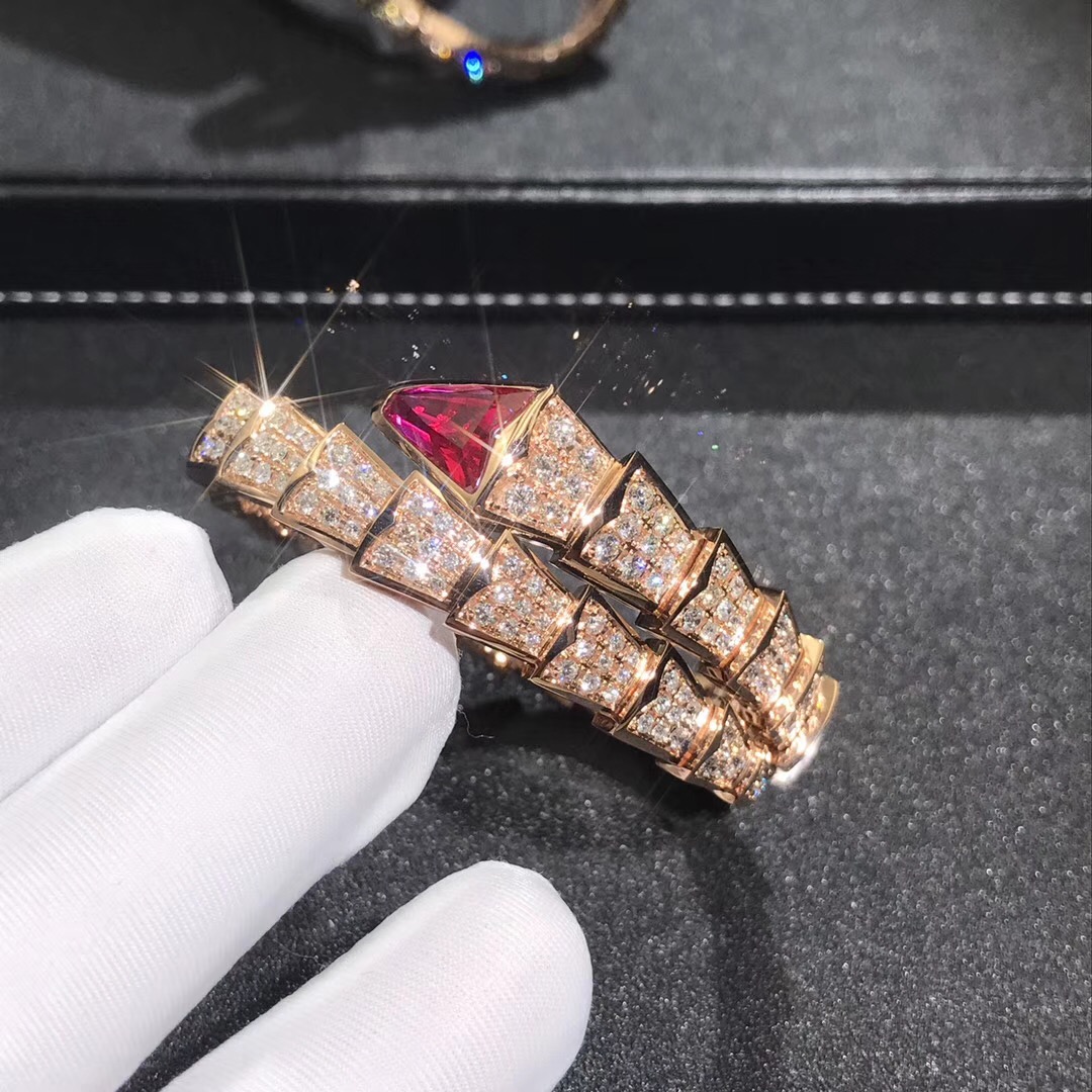 » Bvlgari Jewelry » Inspired Bulgari Serpenti One-Coil Bracelet 18k Rose Gold Pave Full Diamond and Rubellite