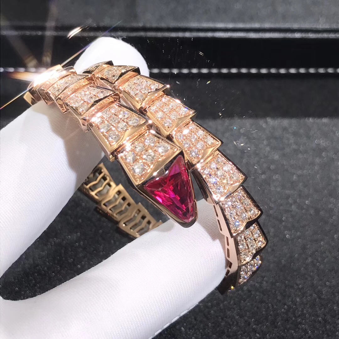 Inspired Bulgari Serpenti One-Coil Bracelet 18k Rose Gold Pave Full Diamond and Rubellite