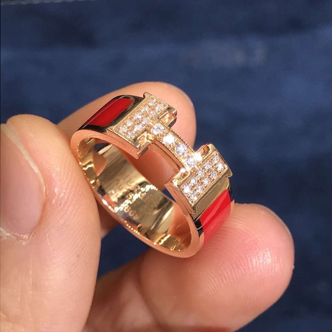The “H” motif found in many Hermes designs is world renowned as well as synonymous withe the finest in luxury. This ring from the collection is made of 18K rose gold and is accented with a lustrous red enamel. Lastly, the “H” motif is set with a 0.20ct diamond pave.