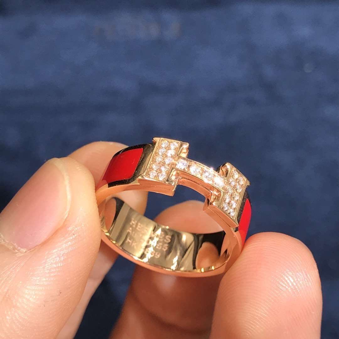The "H" motif found in many Hermes designs is world renowned as well as synonymous withe the finest in luxury. This ring from the collection is made of 18K rose gold and is accented with a lustrous red enamel. Lastly, the "H" motif is set with a 0.20ct diamond pave.