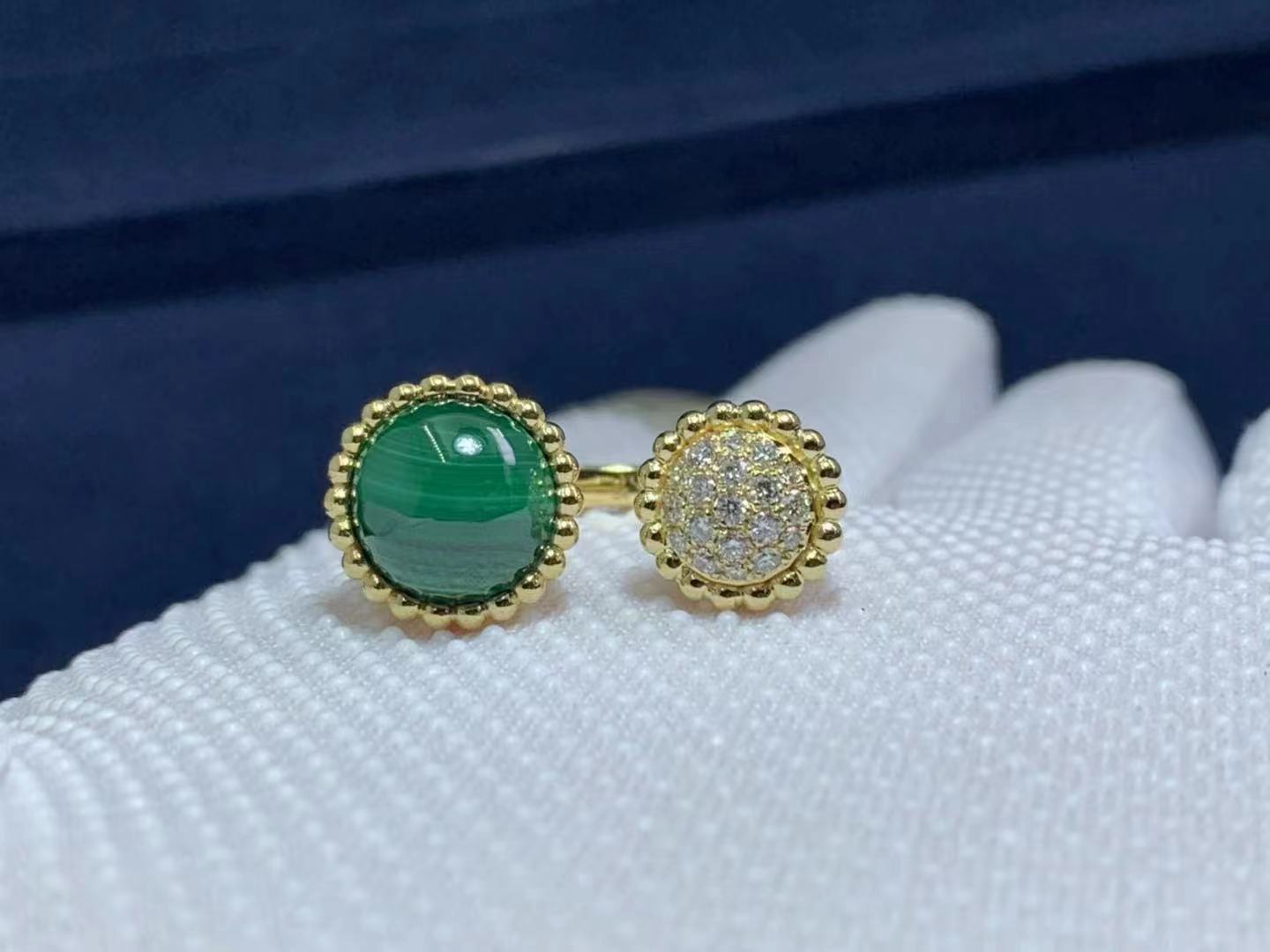Perlée couleurs Between the Finger ring, yellow gold, malachite, round diamonds; diamond quality DEF, IF to VVS.