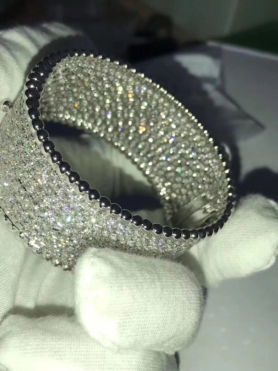 A Perlée masterpiece set with 768 diamonds, this closed cuff with a hidden clasp delicately embraces the arm to enhance the gracefulness of every movement. Edged with golden beads, a host of round diamonds of varied diameters are laid out in staggered rows so that they seem to cover every surface of the jewel and make a stunning play of light. This snow setting technique makes the metal disappear to the stone's advantage while the honeycomb structure accentuates the brilliance and lightness of the piece.