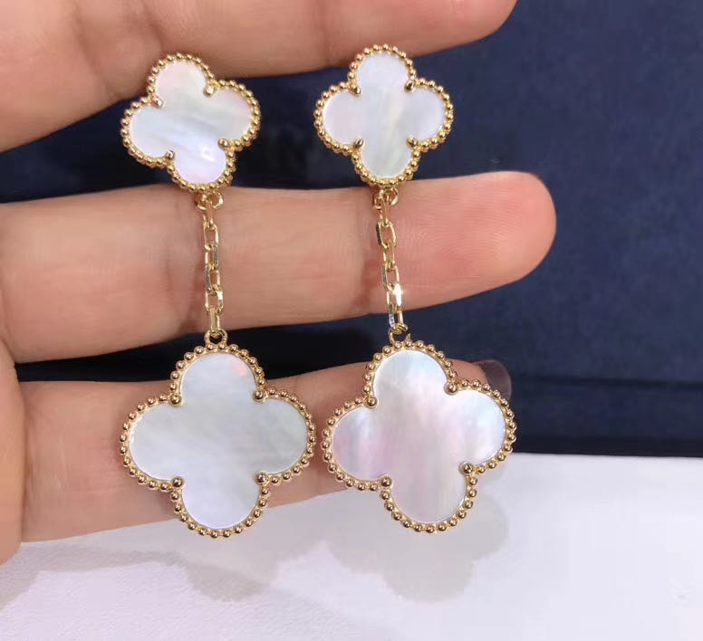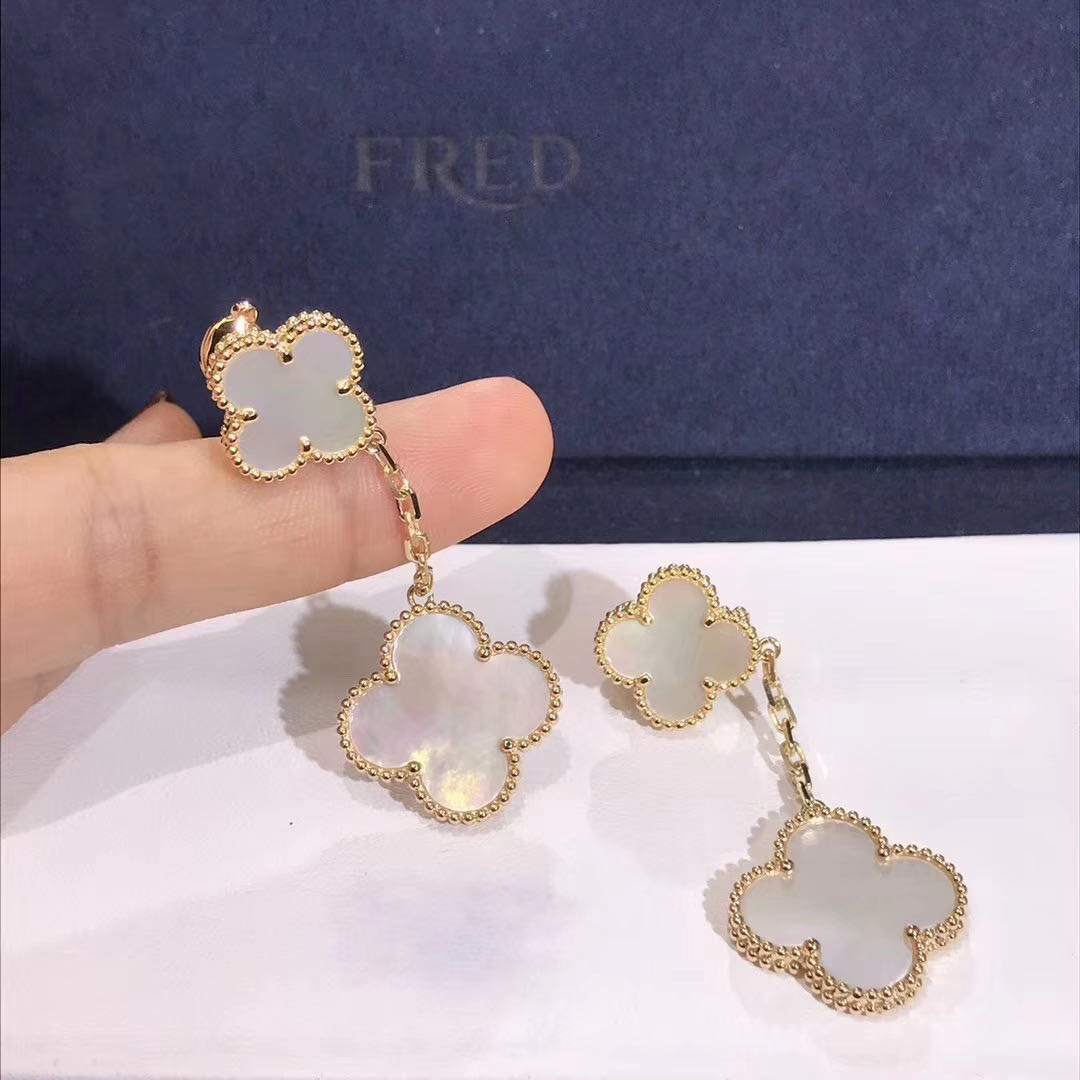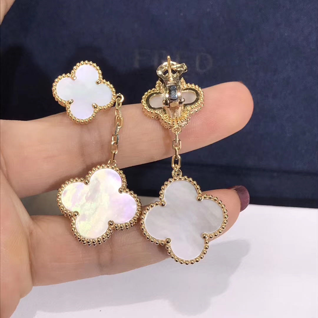 Magic Alhambra earrings, 2 motifs, yellow gold, white mother-of-pearl.
