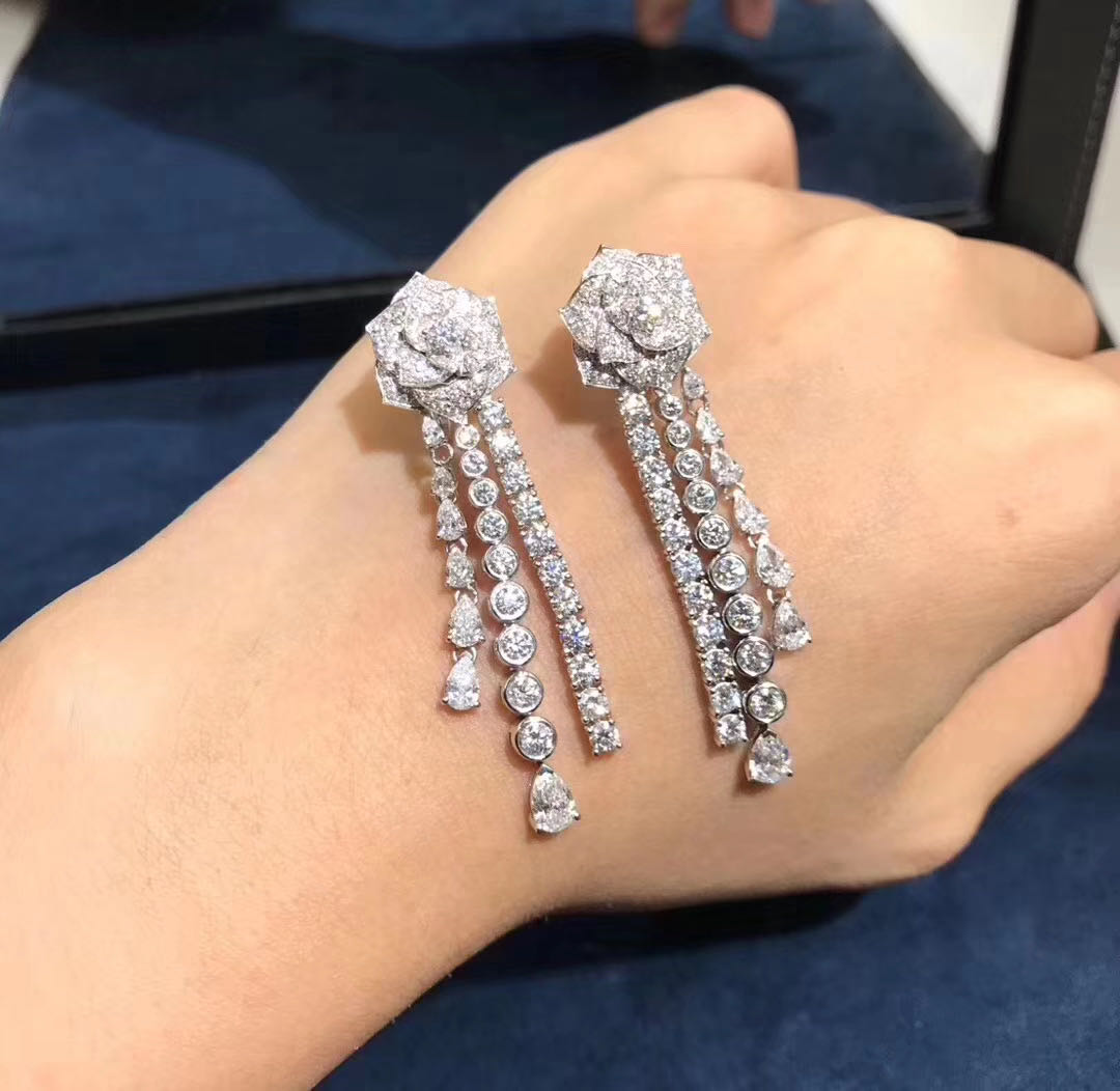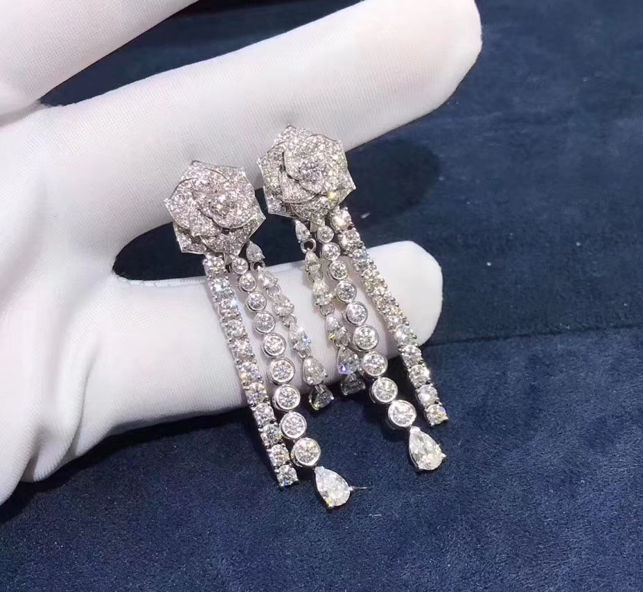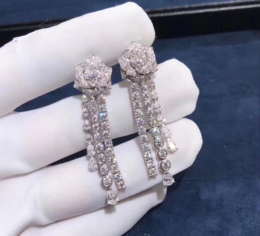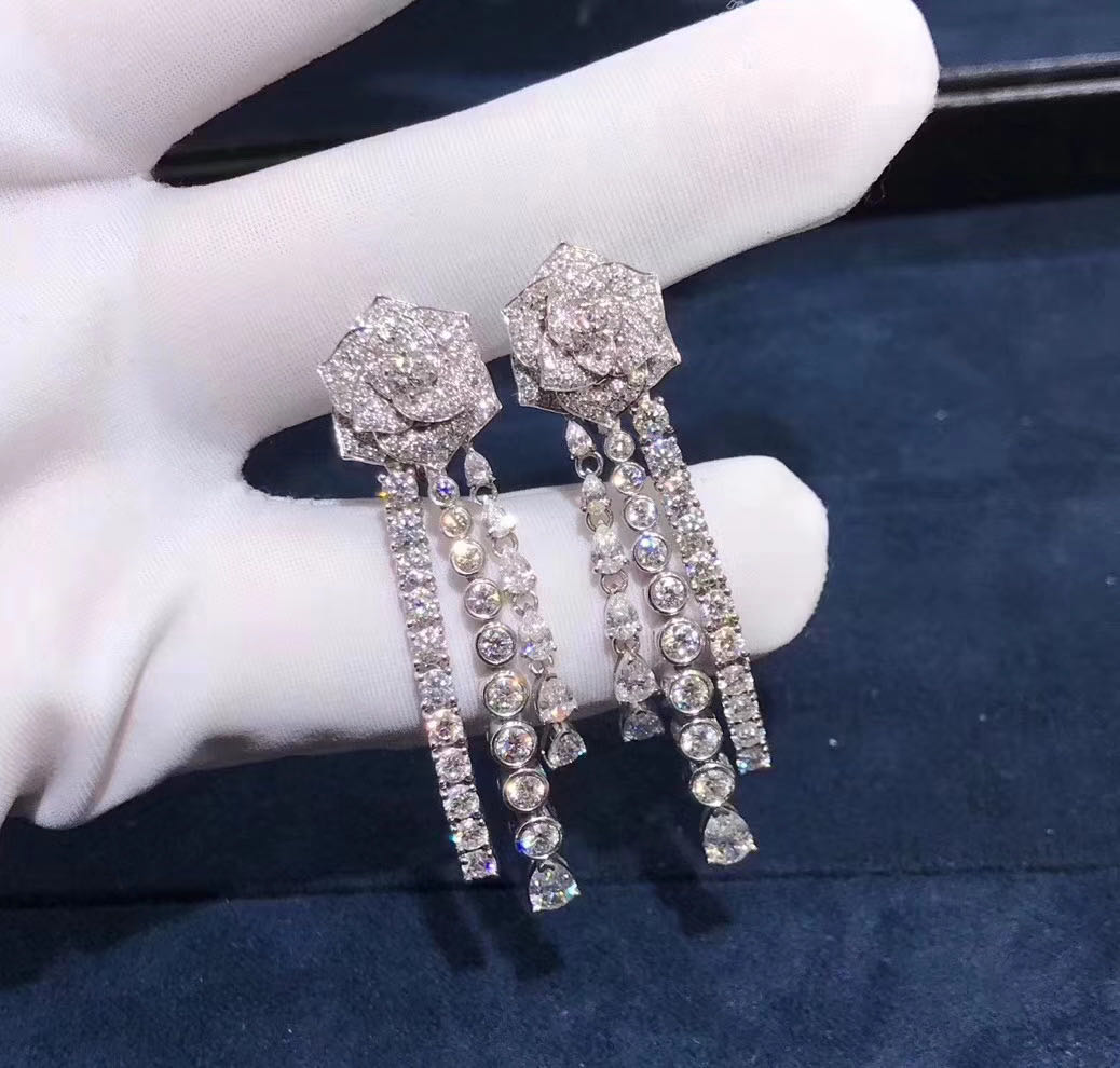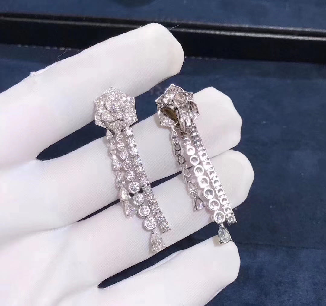 Piaget Rose luxury earrings in 18k white gold and diamonds with cascading diamond chains. Generous white gold diamond earrings reveal the enchanting side of the Yves Piaget rose. Cascading chains of sparkling diamonds flow from a rose like droplets of water falling off the flower’s petals. With her every move, these luxury earrings create a mesmerizing effect as they catch the light, just like a radiant rose covered in morning dew.