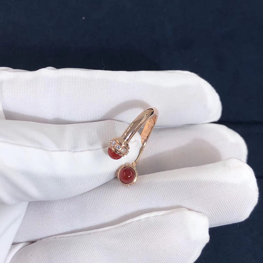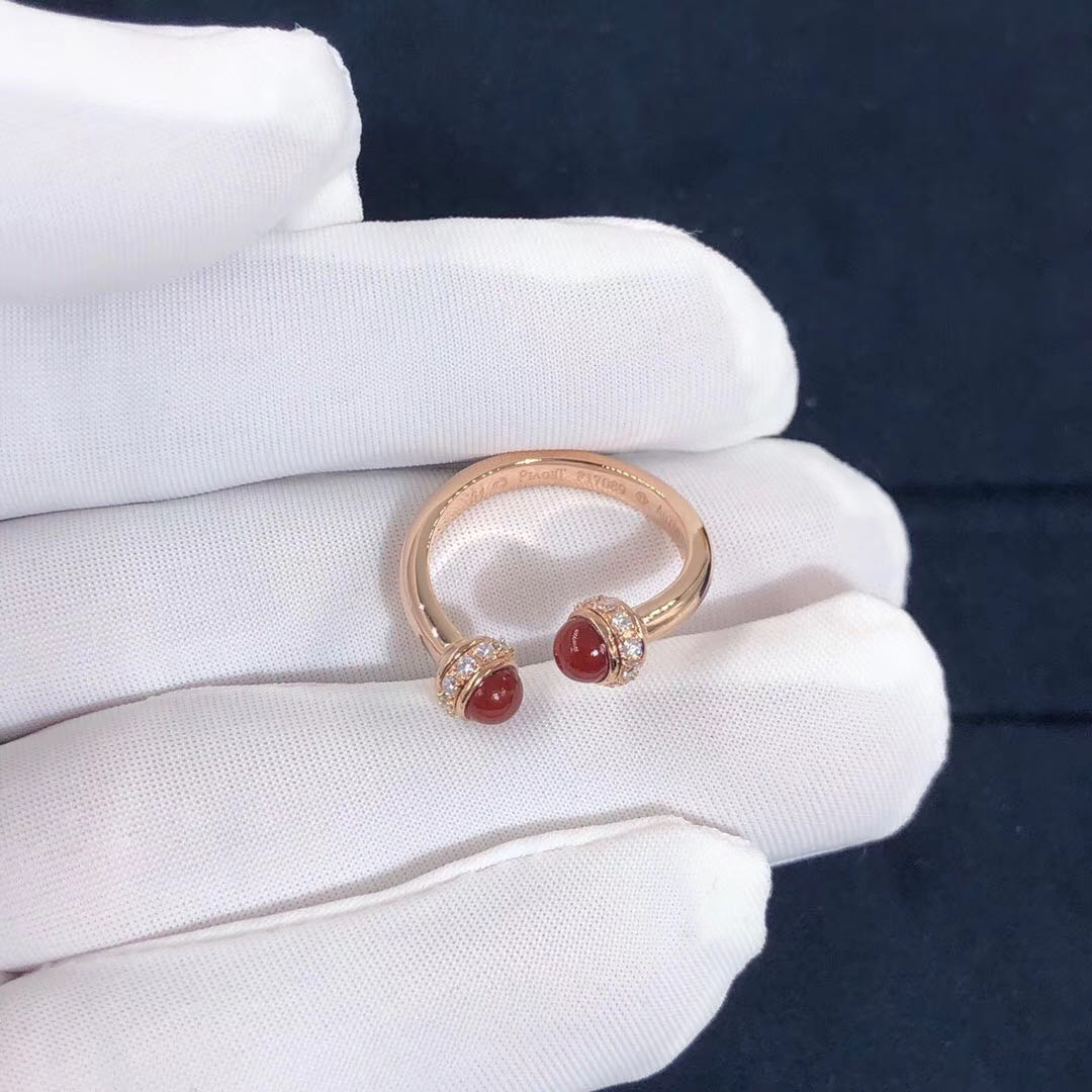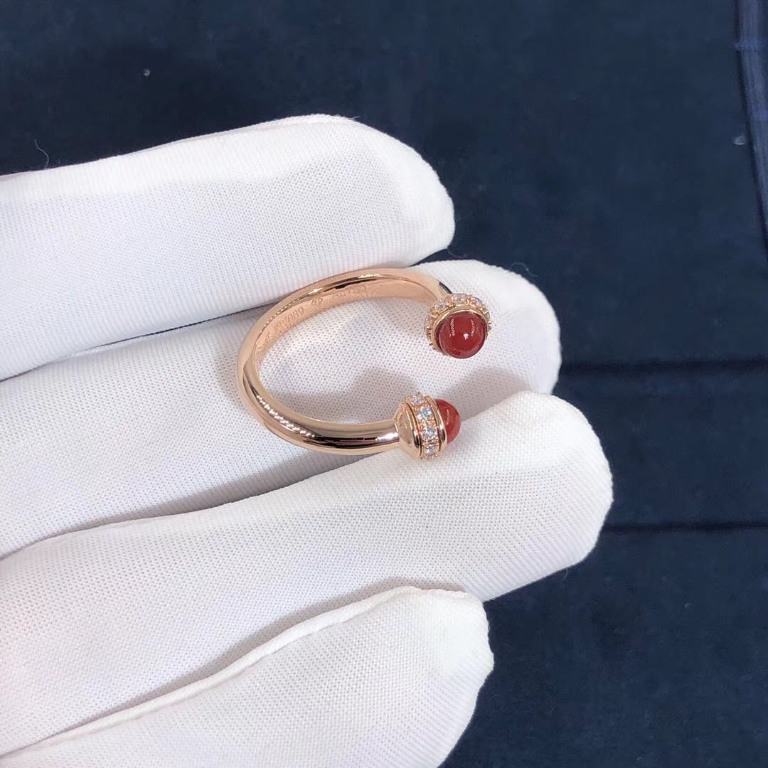 Possession open ring in rose gold and diamonds decorated with green malachite. Inspired by the captivating charms of the Possession open bangle bracelet, this rose gold ring adorned with an ornamental stone echoes the original jewel with its diamond-set turning rings and colored stones. The playful open ring features two diamond-paved turning rings decorated with a bright green malachite on either end. The elegant Possession turning rings move around the finger, transforming the piece into a powerful, dynamic companion.