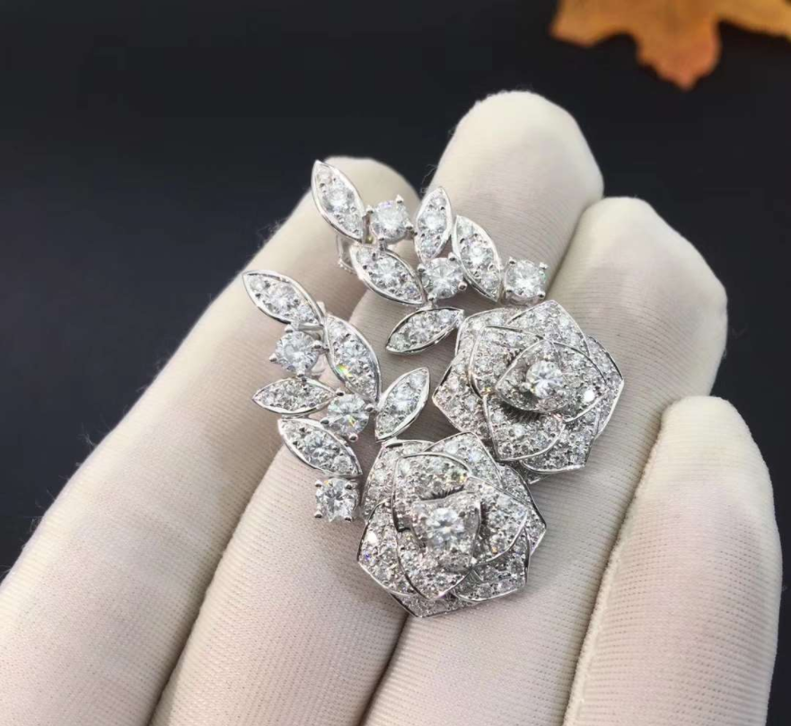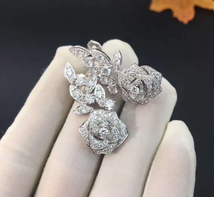 Piaget Rose white gold diamond earrings. Inspiring muse and floral goddess, the irresistible Yves Piaget rose makes a dazzling statement as a pair of luxury earrings. When paired with luminous diamond leaves that climb along the earlobe, the queen of flowers shows off her intense beauty. Forever immortalized as a feminine diamond jewelry creation, she turns heads wherever she goes with her generous sparkle.