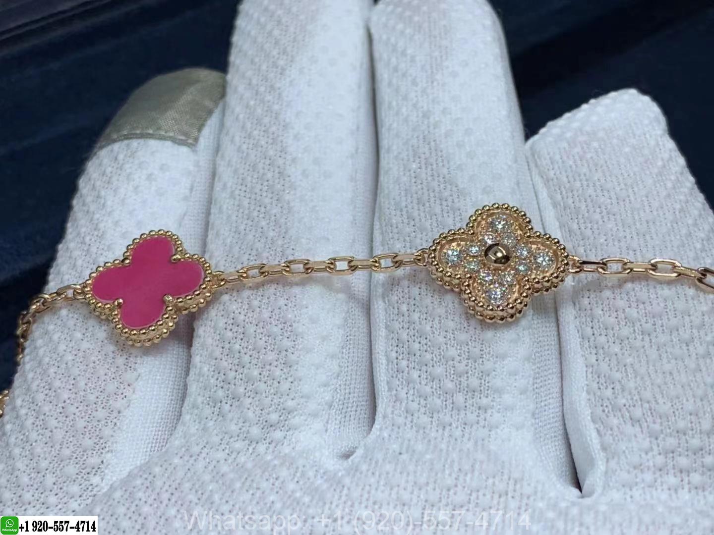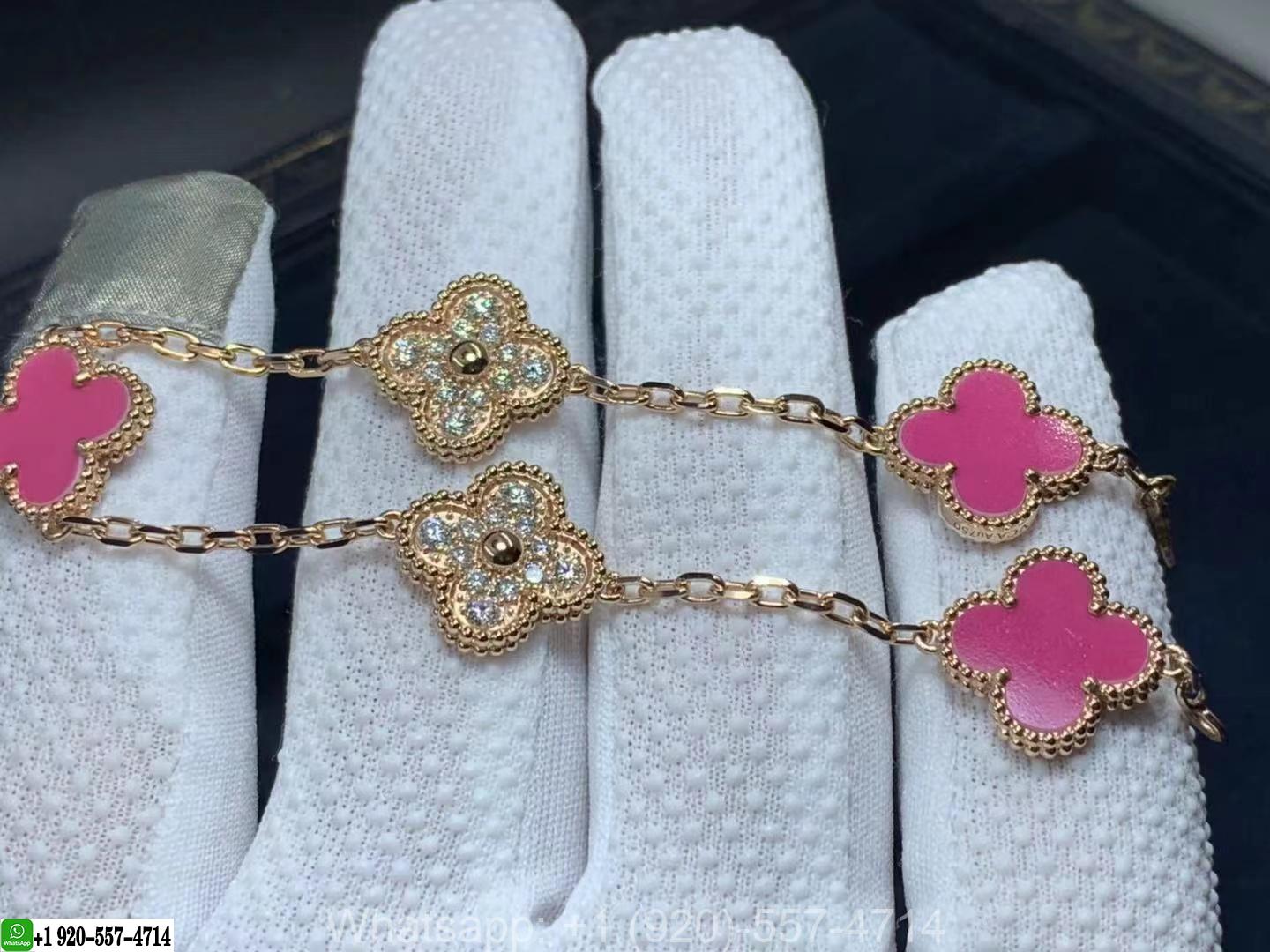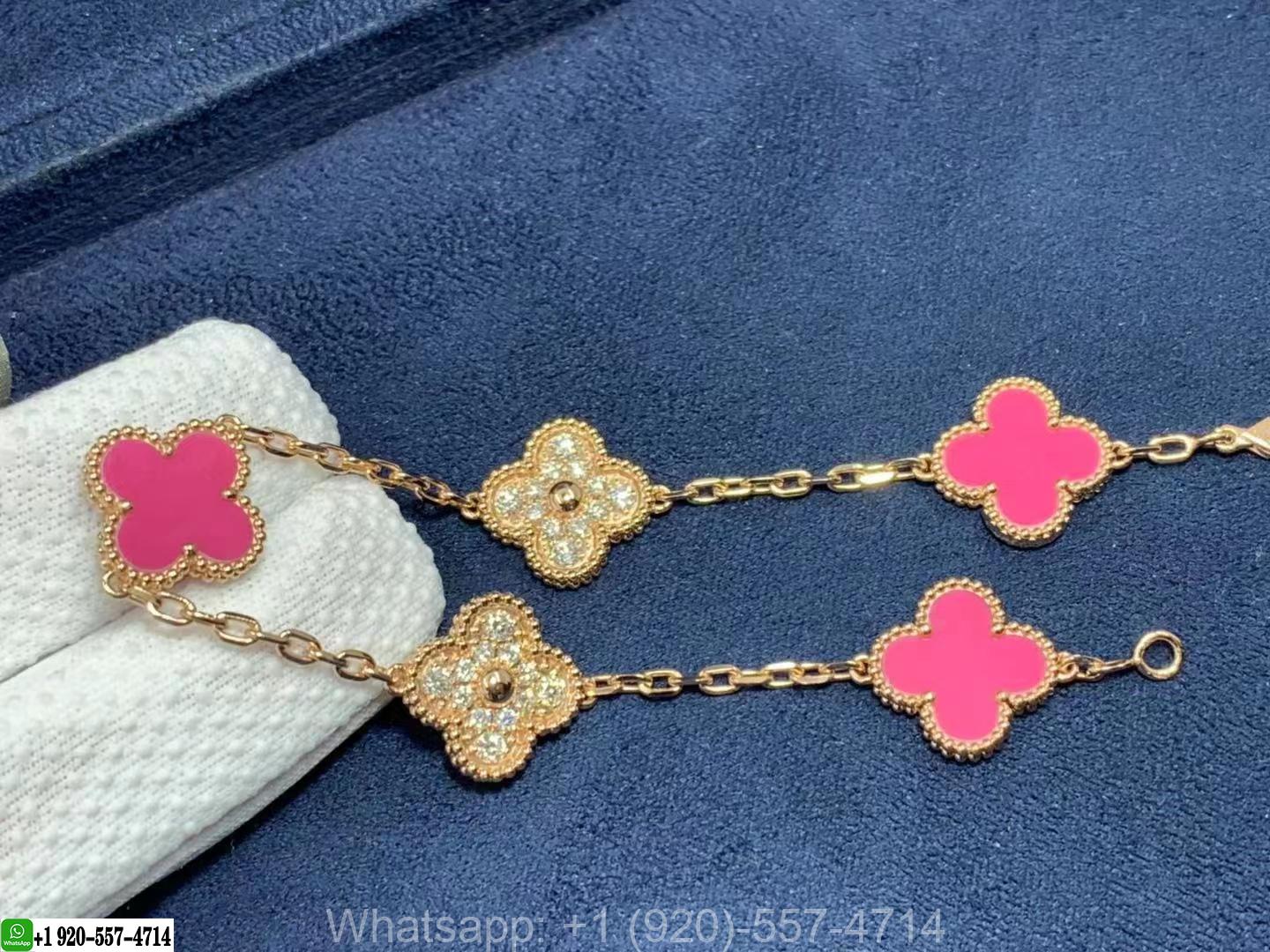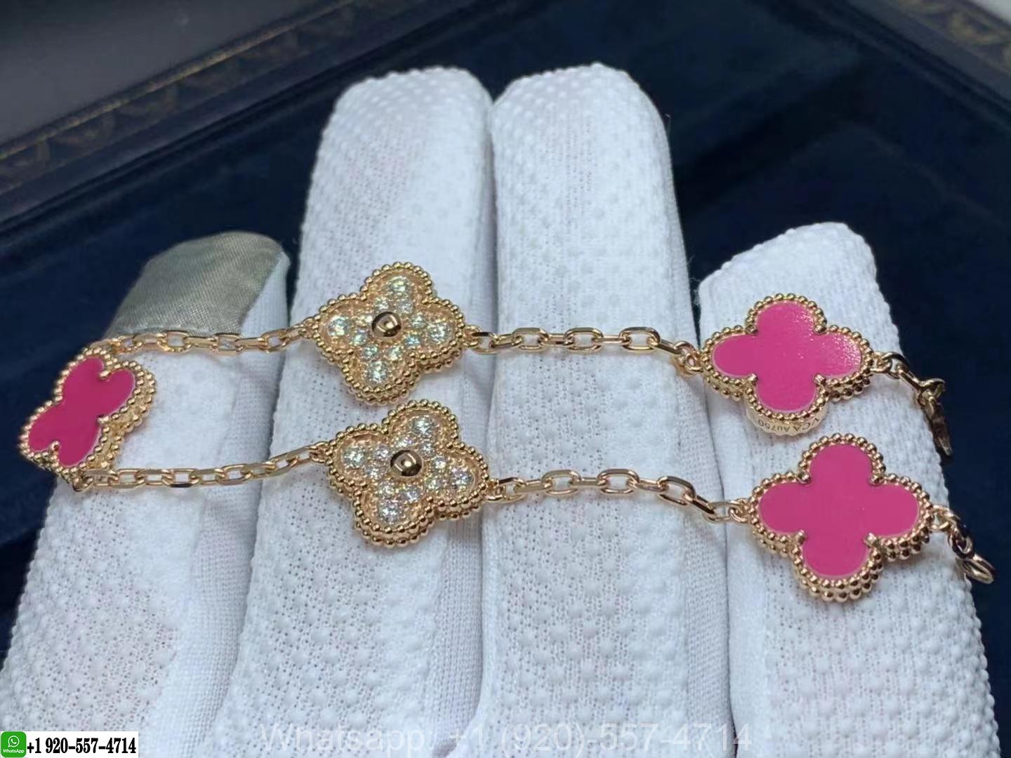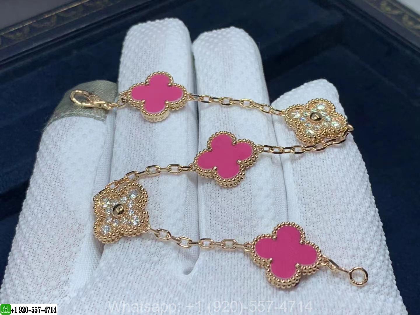 Vintage Alhambra bracelet, 5 motifs, rose gold, pink opal, round diamonds; diamond quality DEF, IF to VVS.