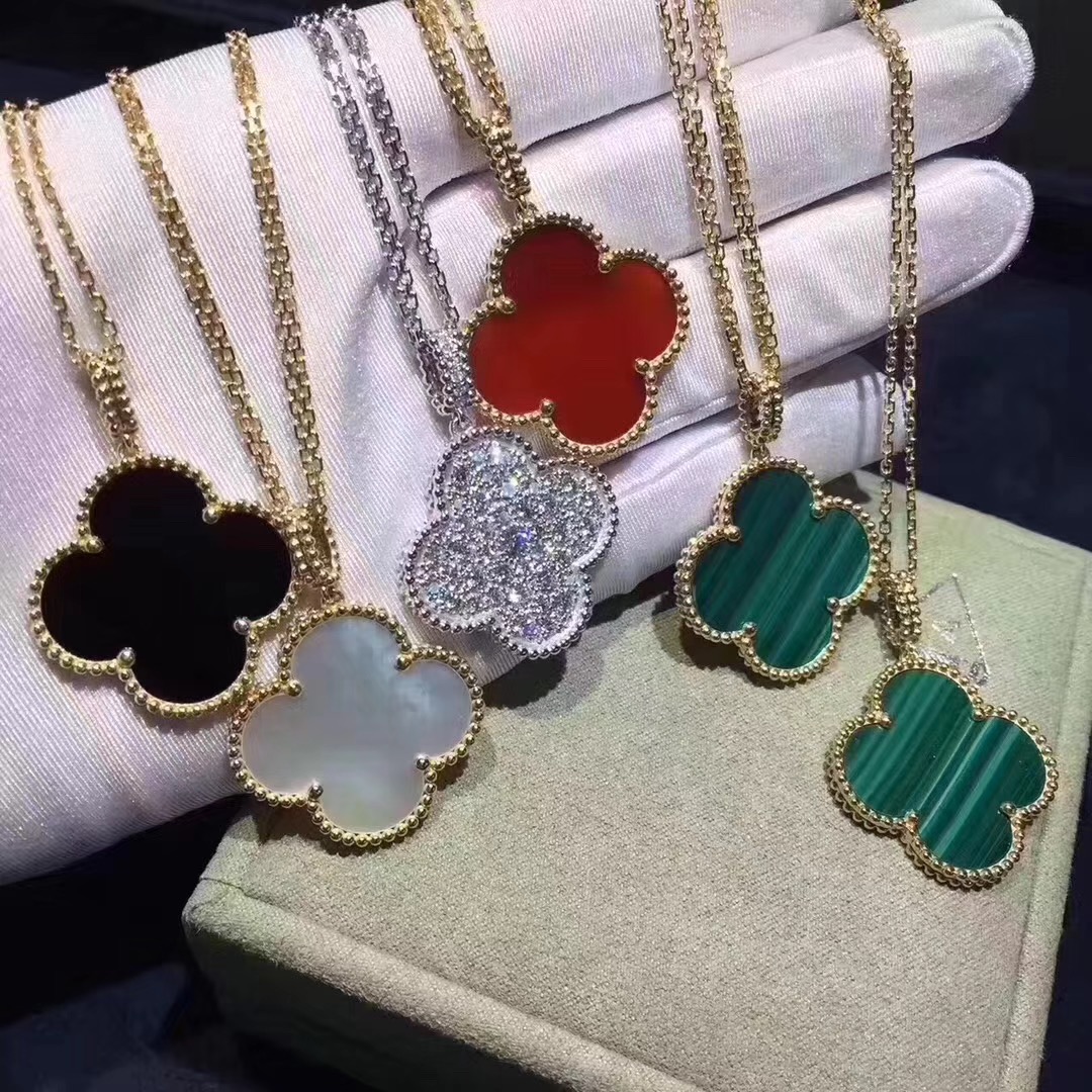 The single-motif Magic Alhambra long necklace reveals another way of playing with the size and materials of the iconic motif. A transformable piece, this jewel may be worn in several ways, including long on a single chain or short with a doubled chain.