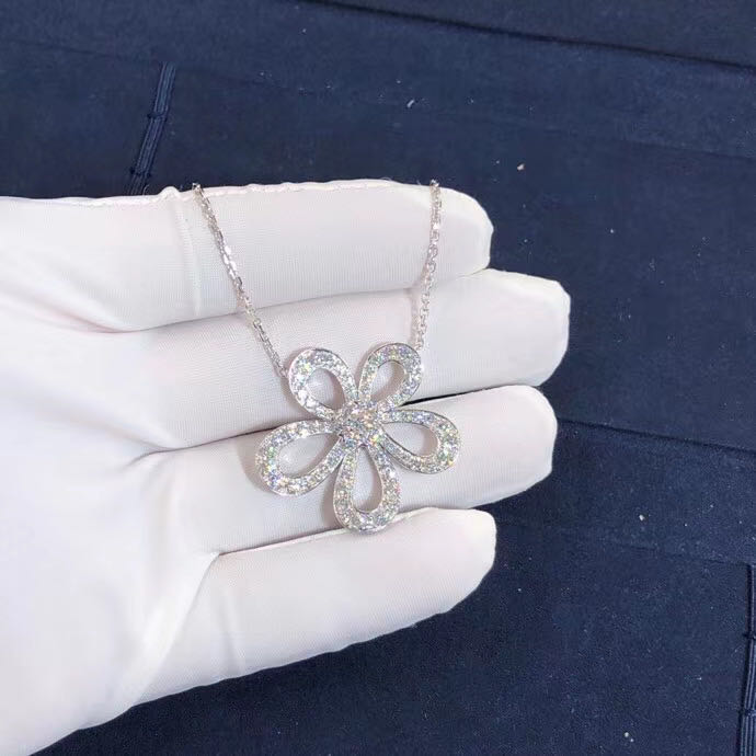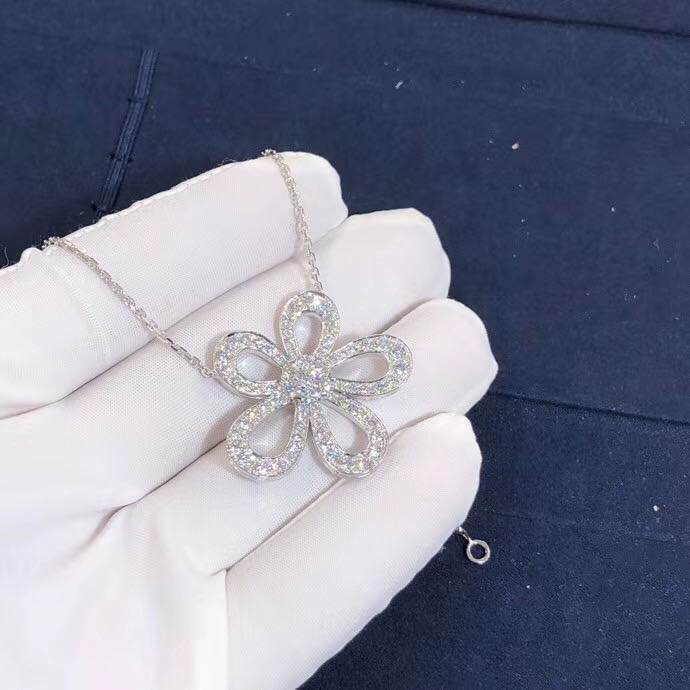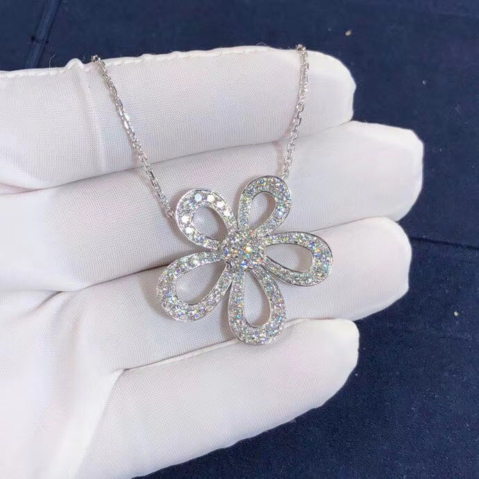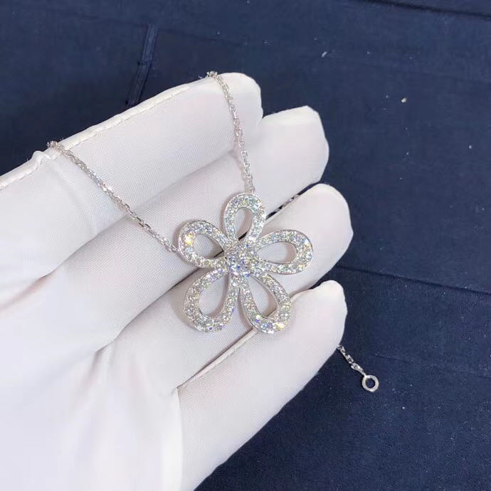 Van Cleef & Arpels Flowerlace Pendant in 18K White Gold with Pave Full Diamonds VCARP05200 – Designed as a flower, the diamond cluster pistil extending to five open petals, to a fine link chain, all in 18k gold.